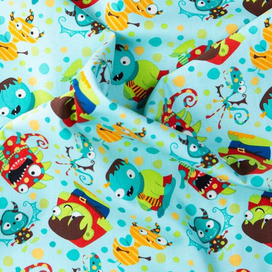 Fun monster themed allover pattern on a mint blue background. Beautiful, high quality, printed cotton fabric. Ideal for quilting, masks, crafts, displays, table decoration and as a dressmaking fabric.