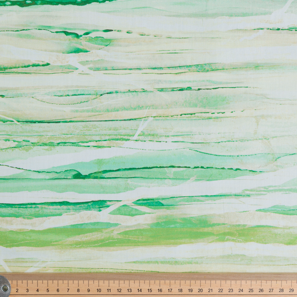 Tie dye stripe in a subtle tree silhouette texture in tones of light green and yellow. Beautiful, high quality, printed cotton fabric. Ideal for quilting, masks, crafts, displays, table decoration and as a dressmaking fabric.