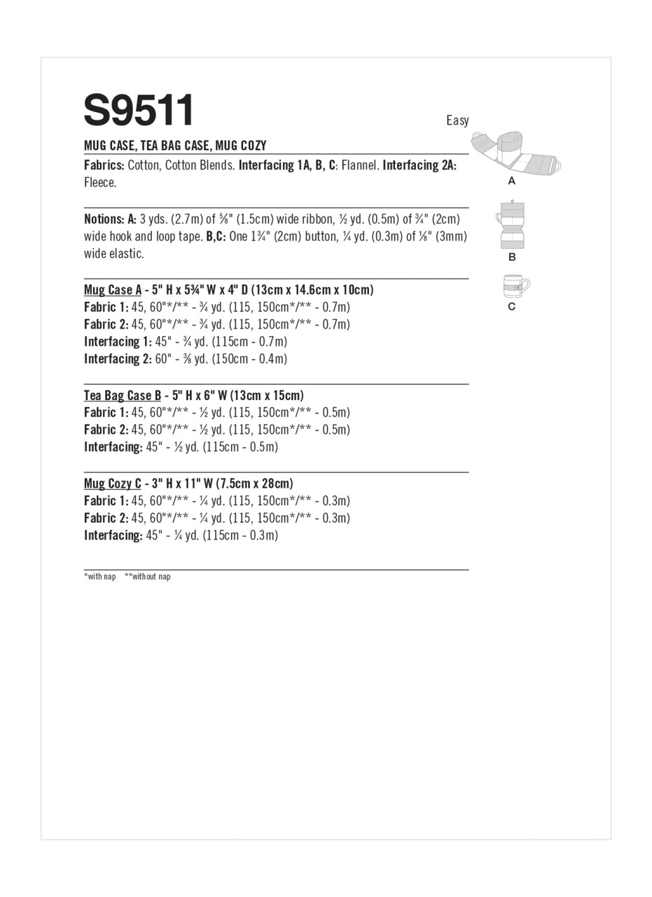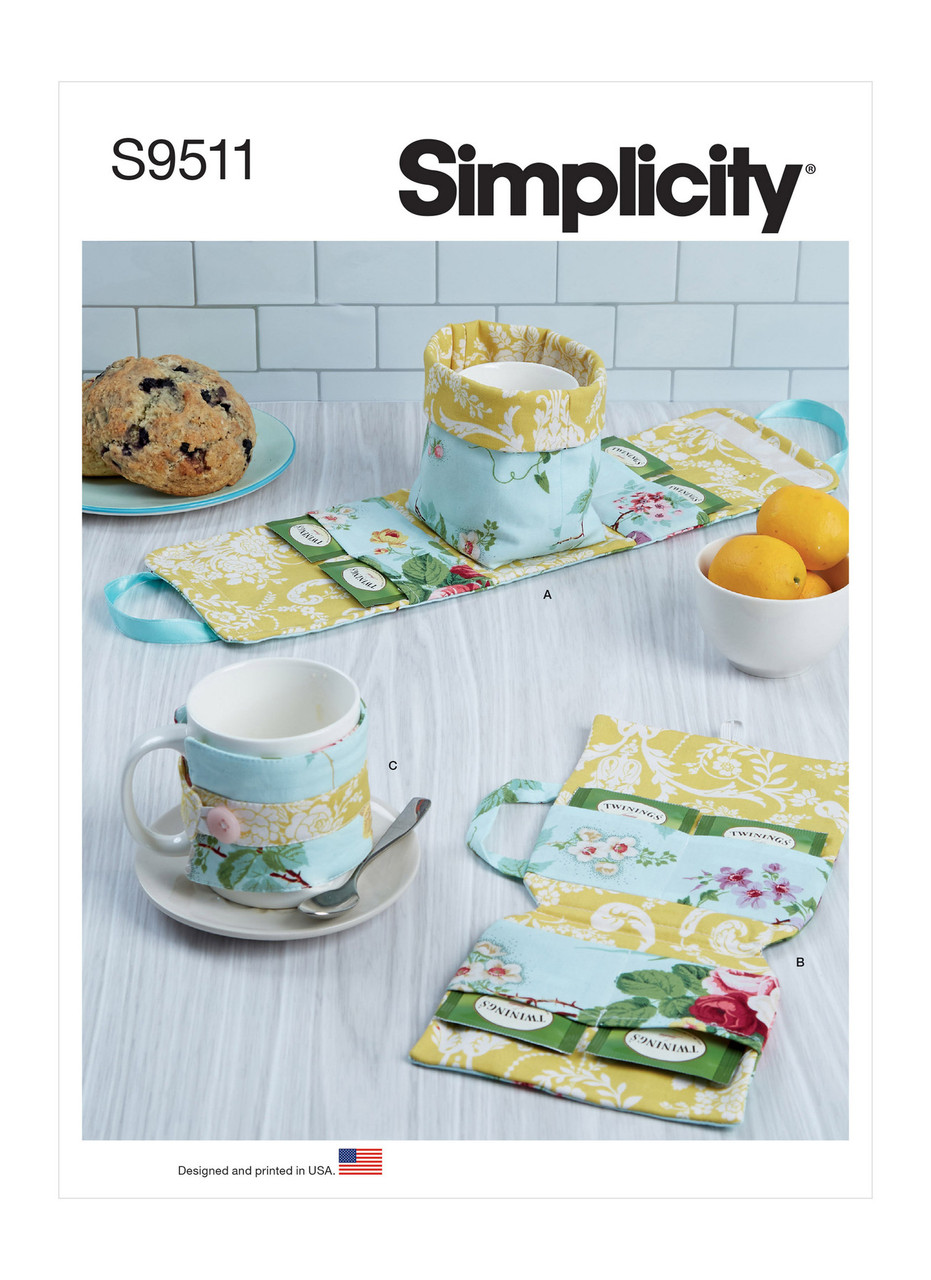 Use a mix of pretty prints for tea time accessories. Mug case with pockets for tea bags and sweetener is 5" H (13cm) x 5.75" W (14.6cm). Tea cup design tea bag case is 5" H (13cm) x 6" W (15cm). Mug cozy is 3" H (7.5cm) x 11" W (28cm).