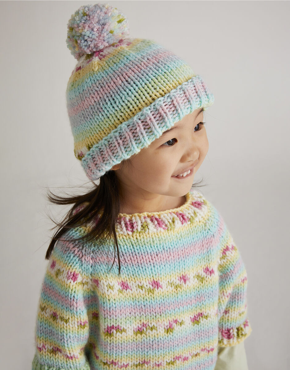 A top-down knitting pattern for knitters who prefer to knit in the round to minimise sewing up. This circular technique means that the stripes of self-patterning Hayfield Blossom travel around the sleeves and body creating a more delicate floral effect than a traditional pieced pattern. This children’s knitting pattern includes instructions for a matching beanie hat with giant pompom to keep your little ones stylish and snug.