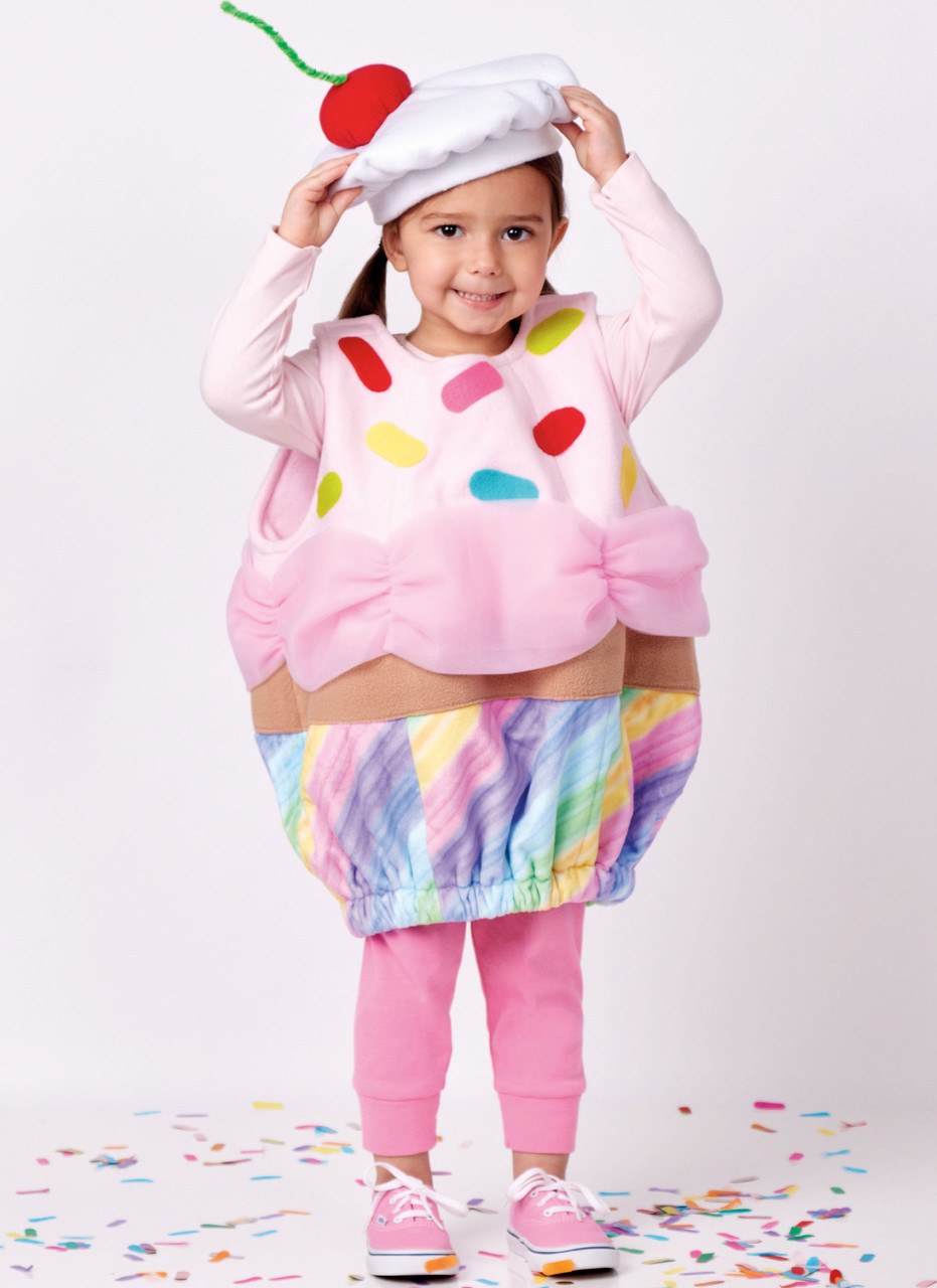 Puffy chicken, penguin, strawberry and cupcake costumes have hook and loop tape closures on both shoulders and elasticized hem with lightly padded body for shape. Chicken and penguin have detachable wings with elastic loops at wrists and lined skullcap style hats with contrast beak panels and elastic chin straps with side snap closures. Strawberry has ruffled leaf collar, beret style hat, seed appliques and 3D blossoms. Cupcake has beret style hat with stuffed cherry, tulle frosting and sprinkle appliques. Hats in three sizes S, M, L. See envelope for more information.