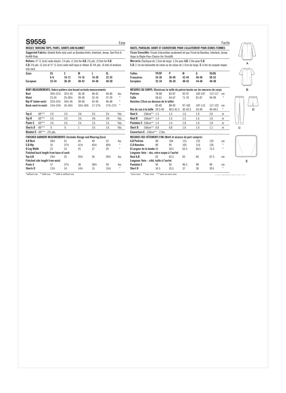 Pull-over tops have round neckband, three-quarter or short sleeves, softly pleated bodice, 1" elastic at hem and hidden nursing panel. Pull-on ankle length jogger and shorts have elastic and drawstring waistband.