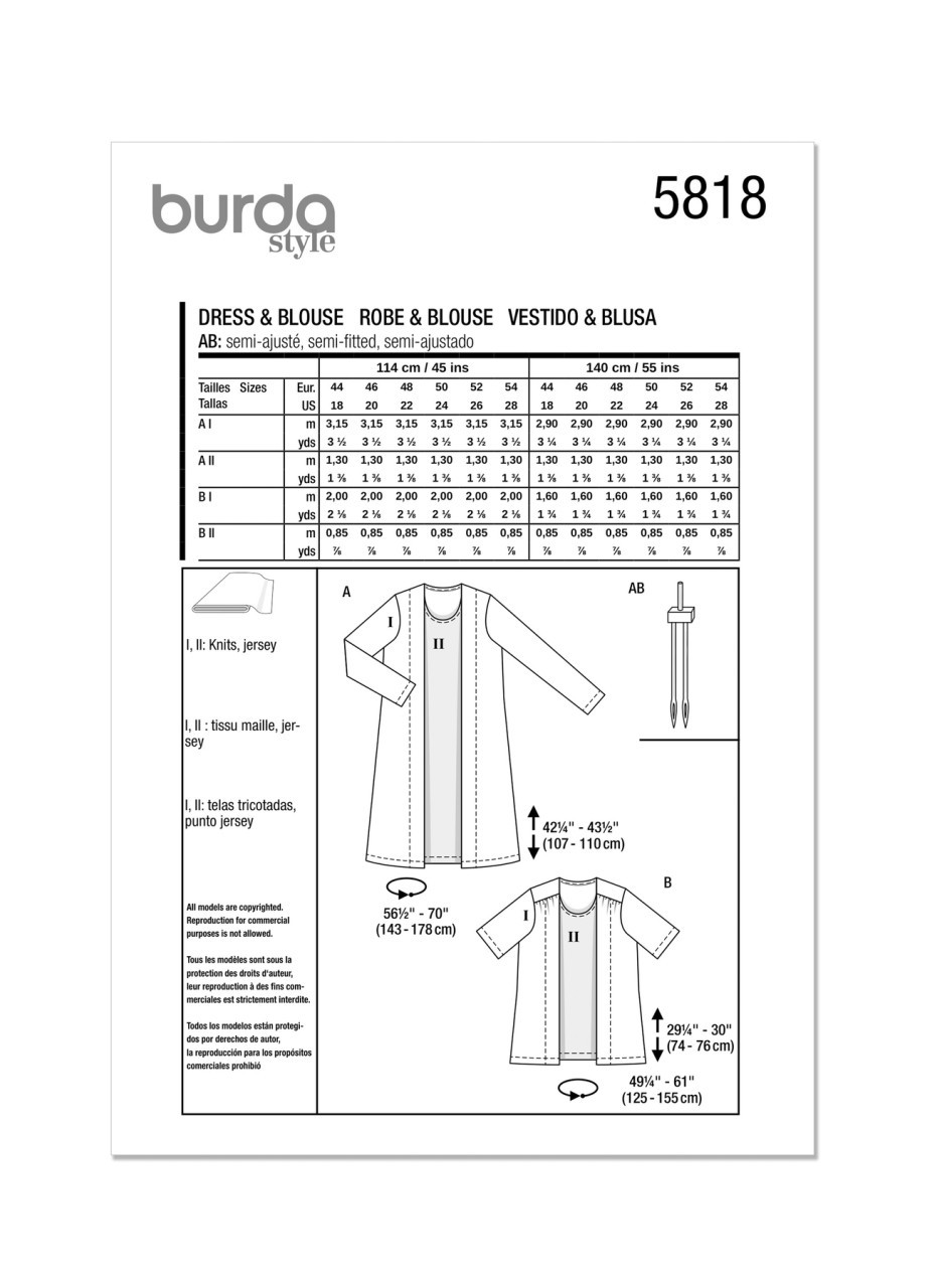Discover our burda curvy dress-blouse set with a sophisticated two-piece effect! The first pattern combines a glittery cardigan and a classy silk jersey dress. The second a shirt pattern that looks like a striped T-shirt with cardigan.