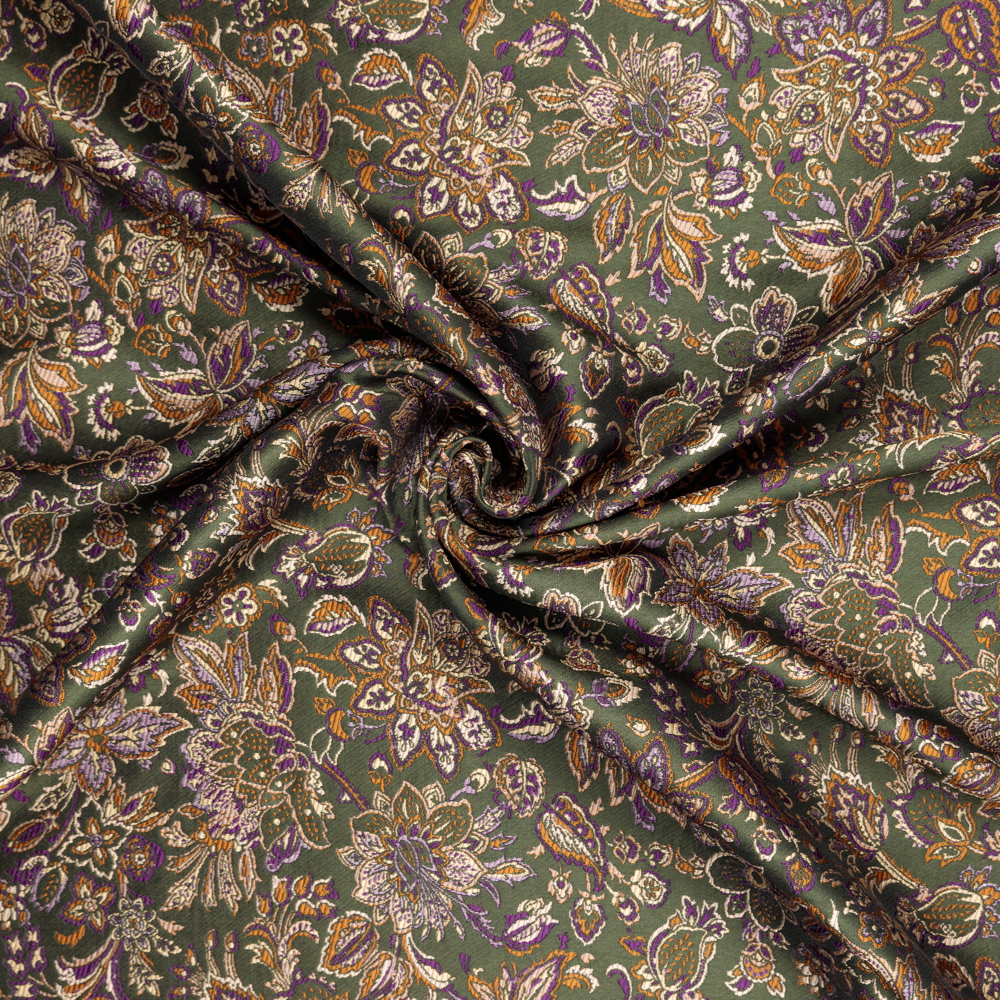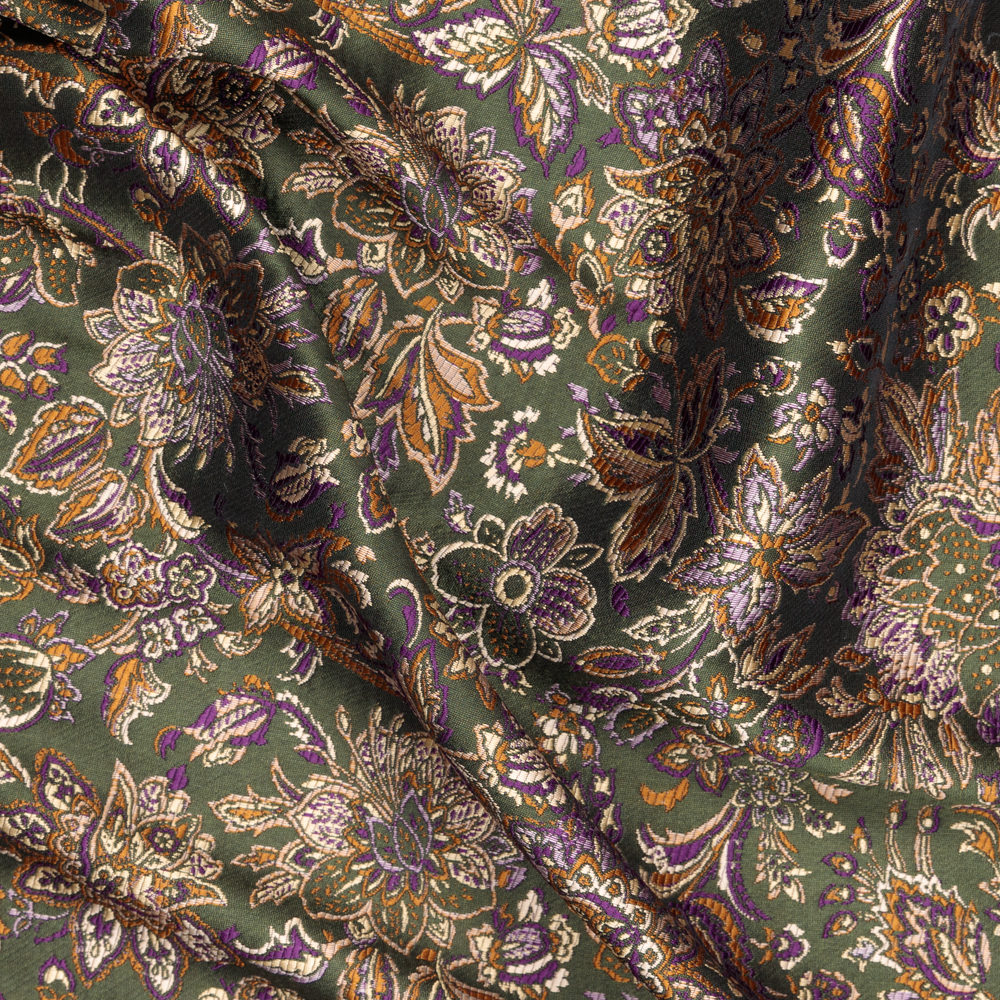 Feel eternally beautiful with this Paisley Brocade in Rich Olive & Purple. Orange, Purple, and lilac flowers unfold across an olive green ground. The semi-structured drape yet soft to touch hand creates voluminous silhouettes for special occasions; imagine stunning ball gowns, sumptuous circle skirts, unique corsets, structured jackets, and more! Plus, you can increase comfort, opacity, and luxury with the addition of a silk habotai lining!