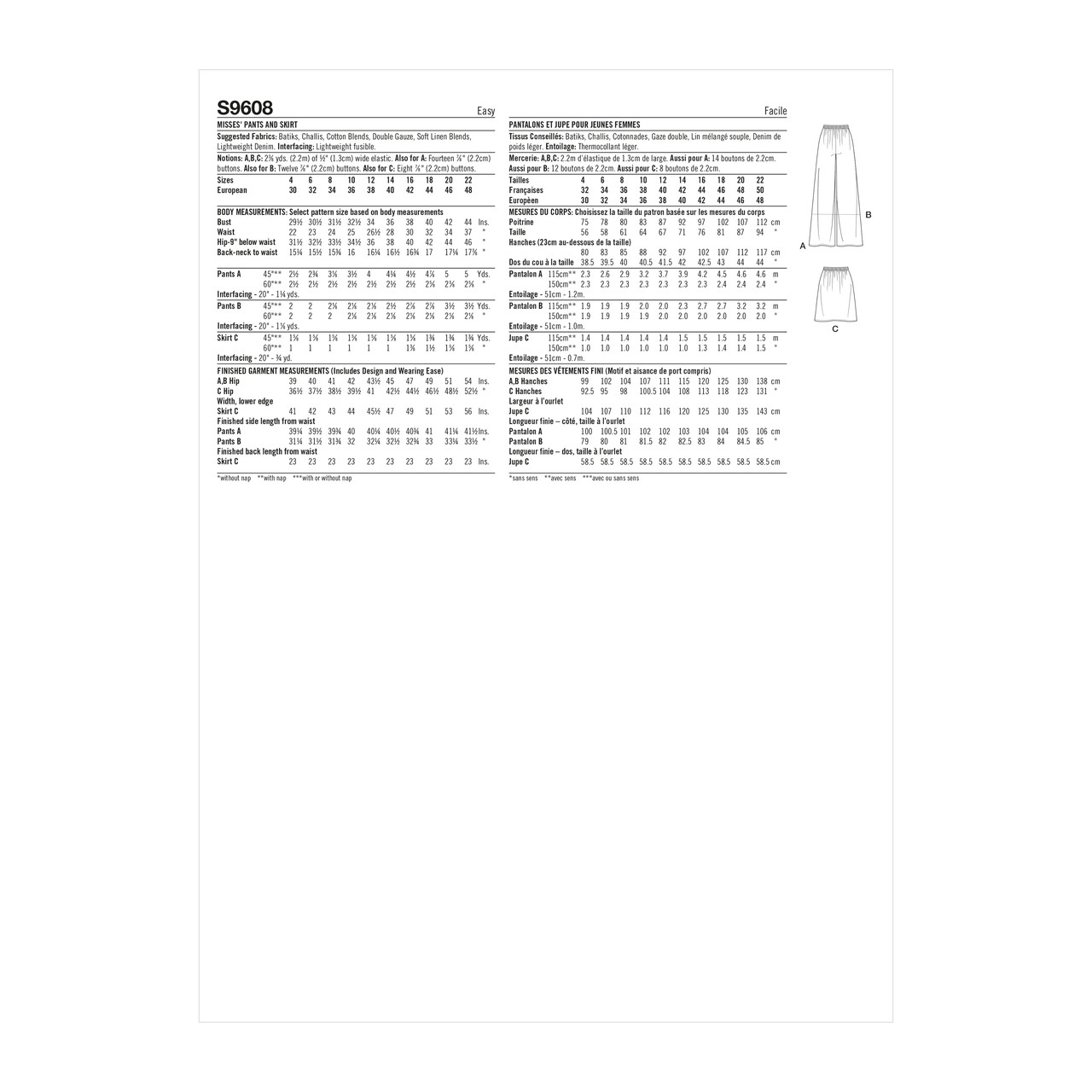 Wide leg pants and skirt have elasticized waistband and functional button placket on side seams. Pants have variations for long and cropped lengths.