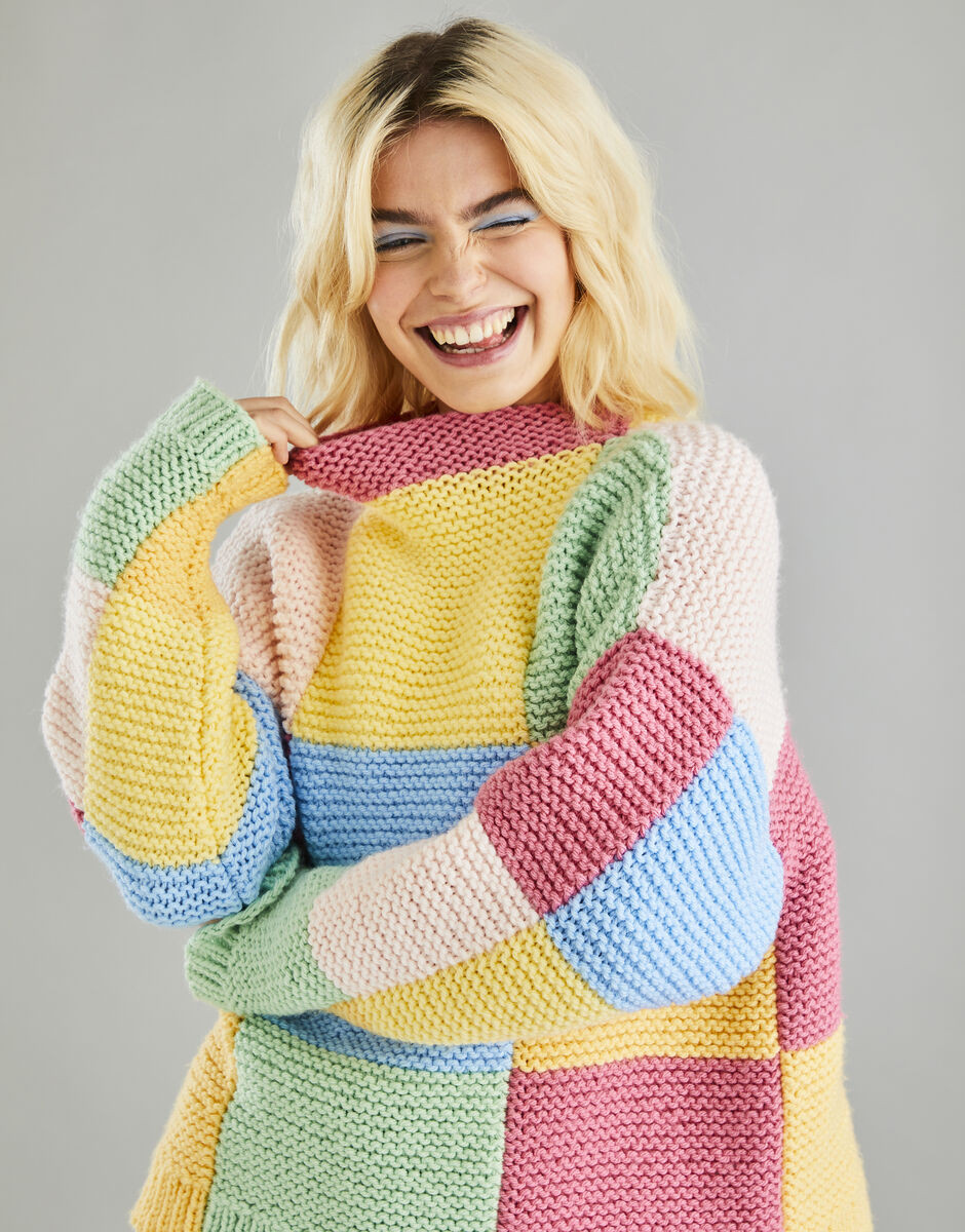 If you've never tried intarsia technique, this knitting pattern from our Pop Art collection could be the perfect introduction. You'll use intarsia to join simple blocks of colour in this bold, playful patchwork design. Featuring a cosy funnel neck and relaxed drop shoulders, this sweater will add a pop of colour to colder seasons.