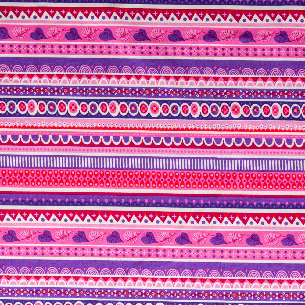 Deco-stripes in shades of pink and purple. Beautiful, high quality, printed cotton fabric. Ideal for quilting, masks, crafts, displays, table decoration and as a dressmaking fabric.