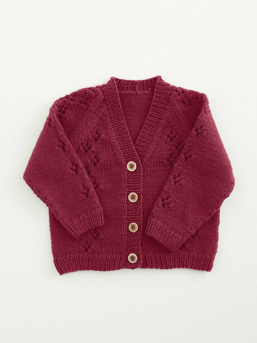 These adorable dungarees and co-ordinating cardigan feature delicate lace panels that look like little paw prints. The cardigan has fully fashioned raglan sleeves and the dungaree straps cross at the back for a neat fit while buttons on the front of both make dressing and undressing easy.