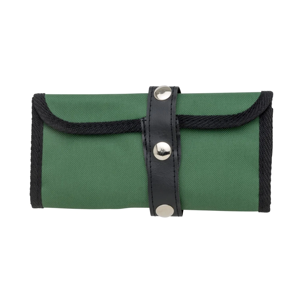 - Green rollable bag made of nylon fabric with an artificial leather bottle with a push button as a lock