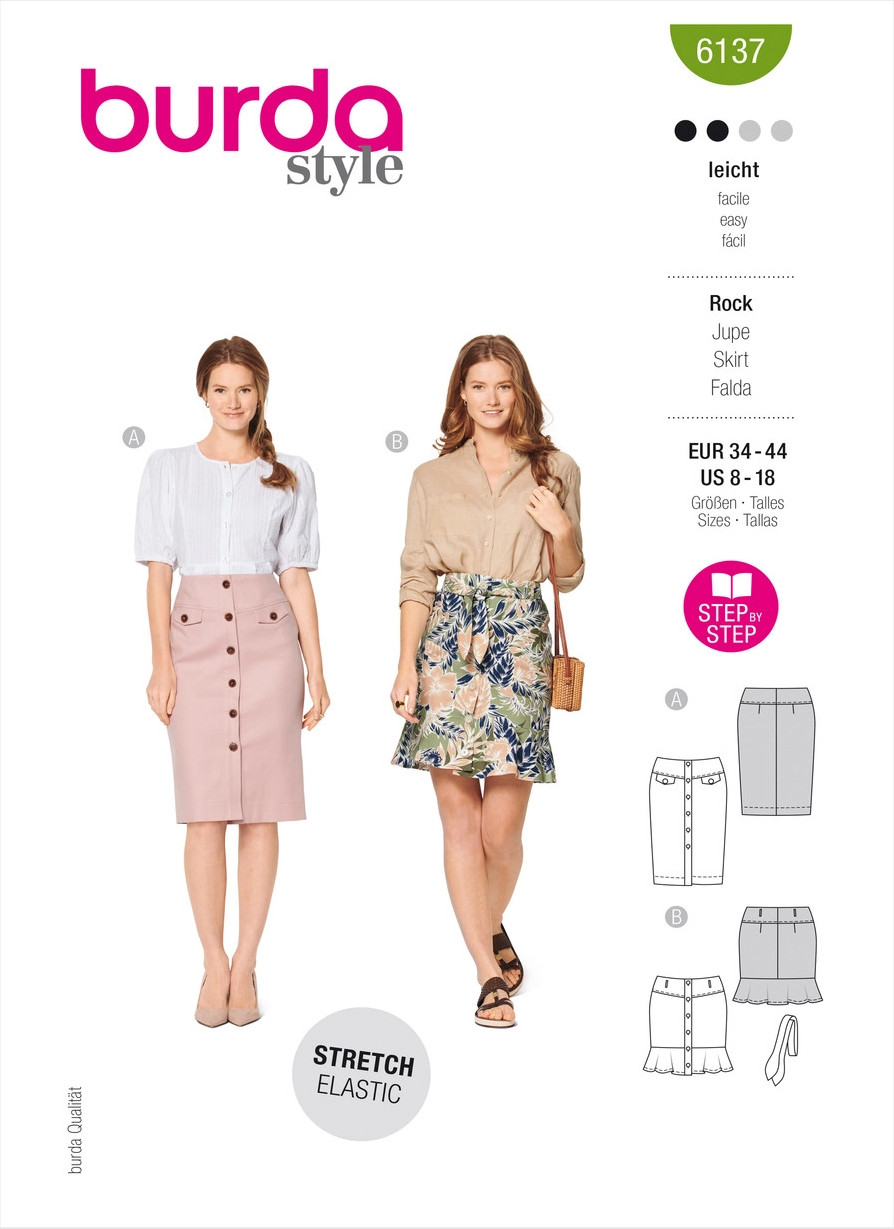 Here is one of this season's trendy skirt styles: a slim shape, a hip yoke instead of a waistband and a front button fastening. Create the typical denim skirt look with flaps and decorative topstitching. If you prefer more fanciful styling, choose the short skirt with the hem flounce and a tie belt.