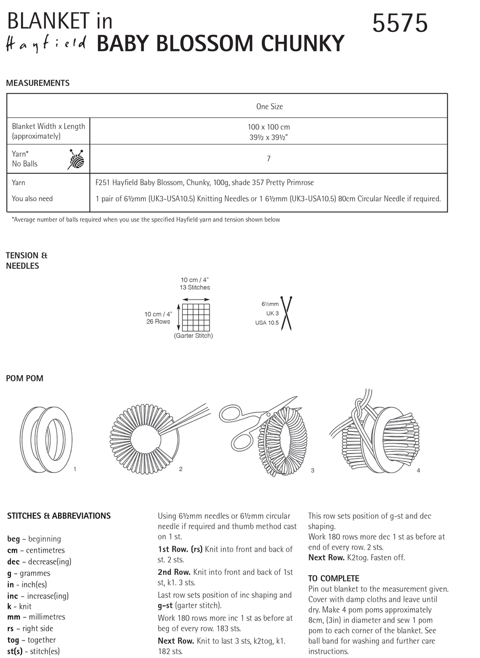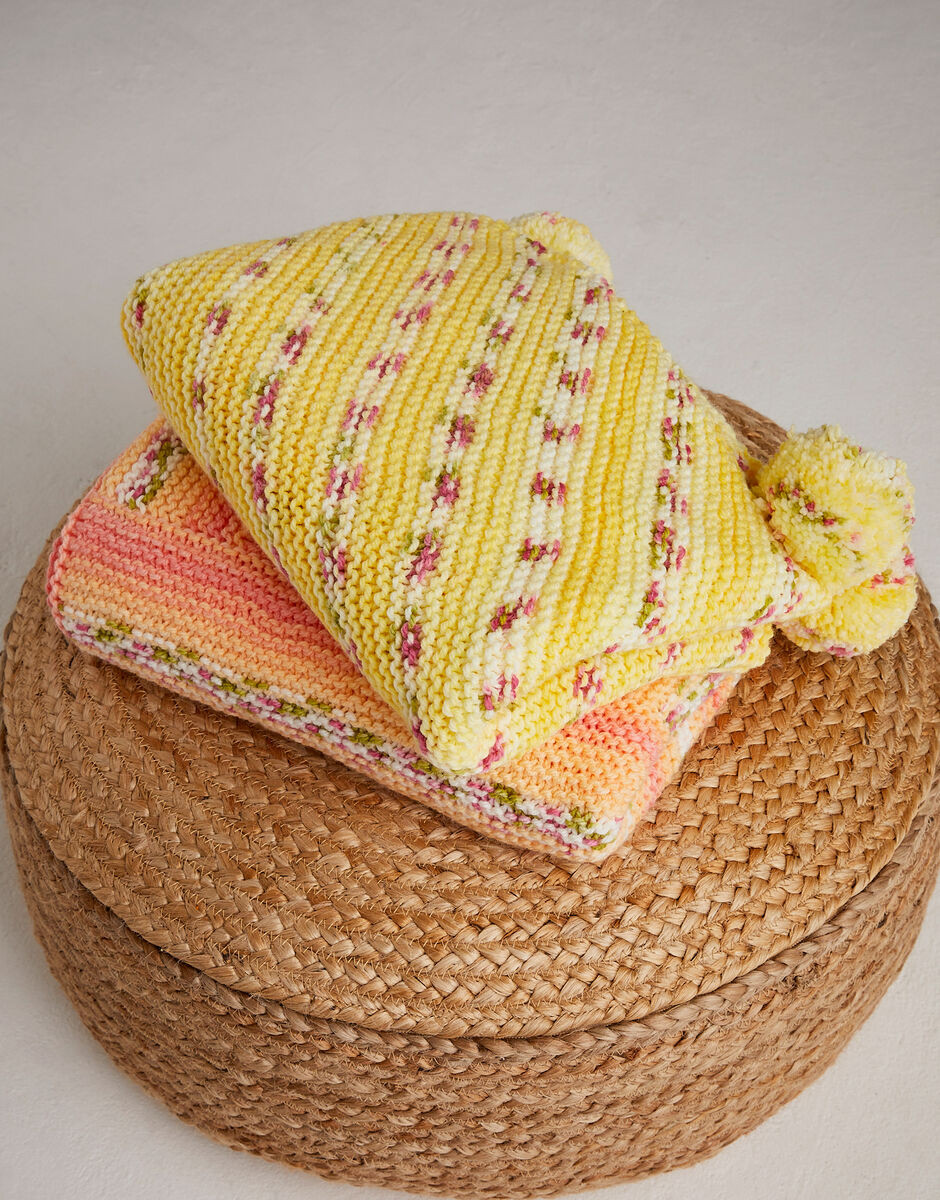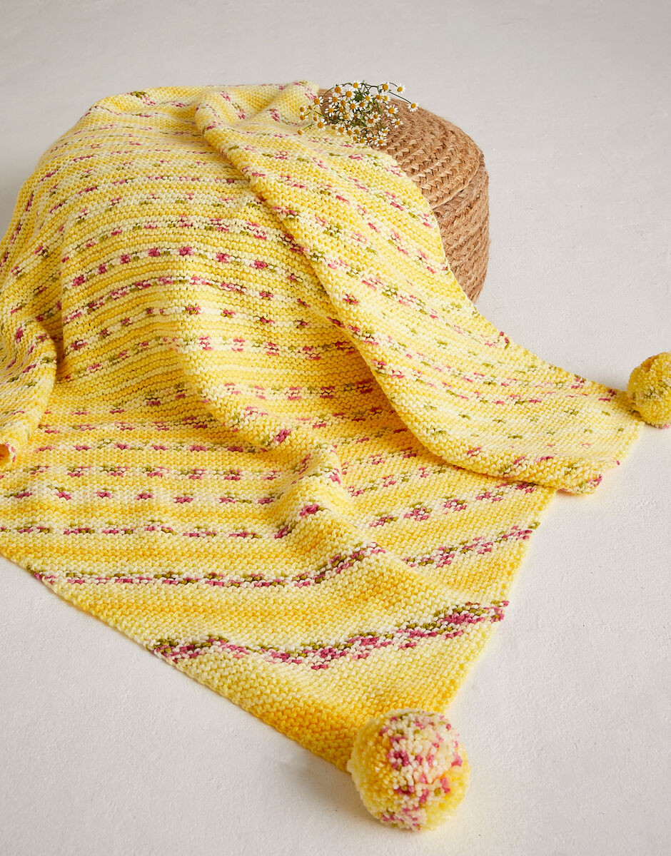 The Petal Pom Pom blanket is the perfect knitting pattern for practising your increasing and decreasing. Pretty diagonal stripes appear as you knit corner to corner in self-patterning Hayfield Blossom. Just add pom poms to complete your beautiful baby blanket knitting pattern.