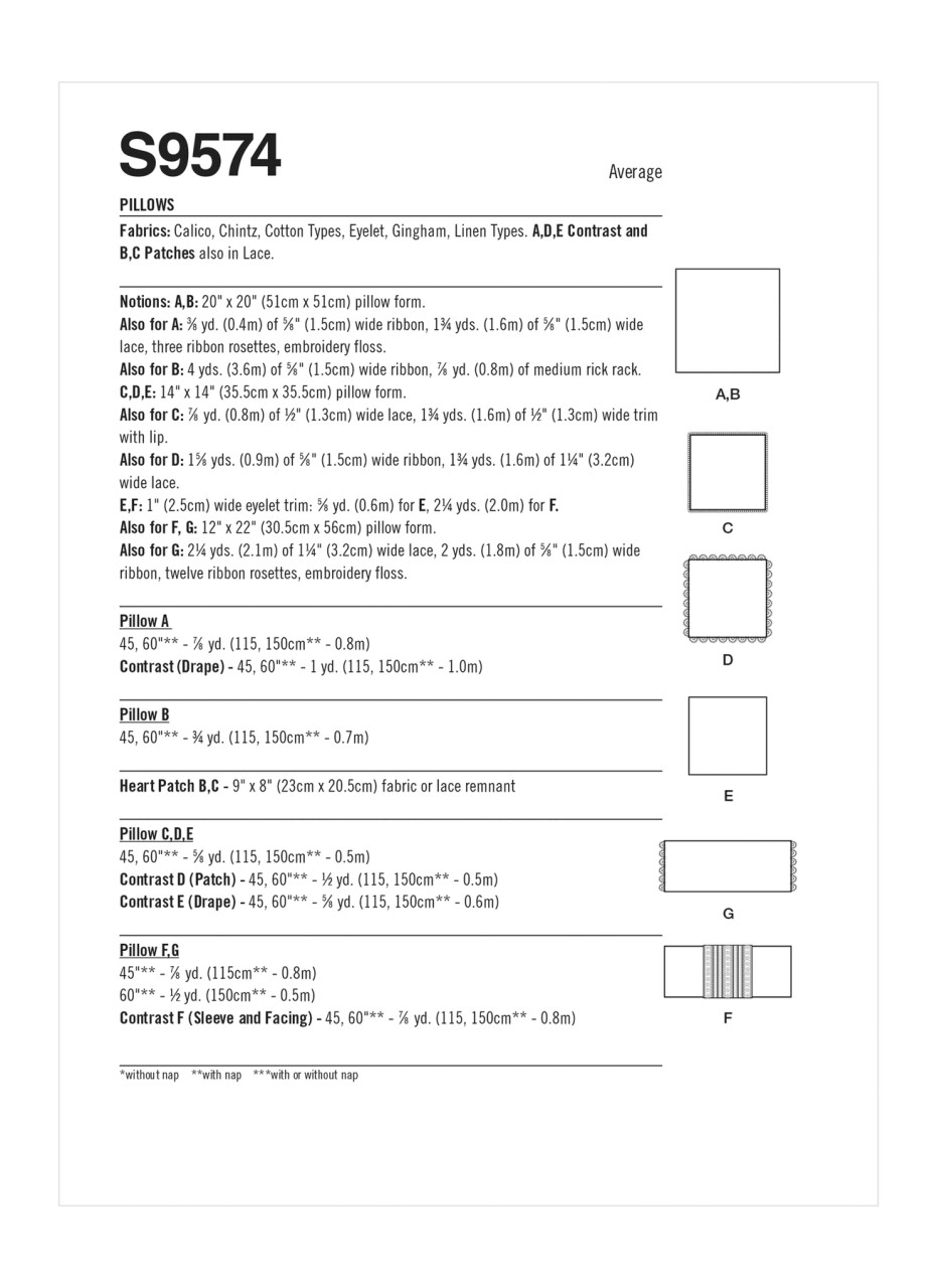 Pretty pillows use 20" x 20", 14" x 14" or 12" x 22" pillow forms and have a variety of lace, ribbon and eyelet embellishments. Square pillows can be made with heart appliques, lace patch or contrast fabric front drape with knot detail. Lumbar pillows have pintucked sleeve or rosettes and embroidery. See envelope for more information.