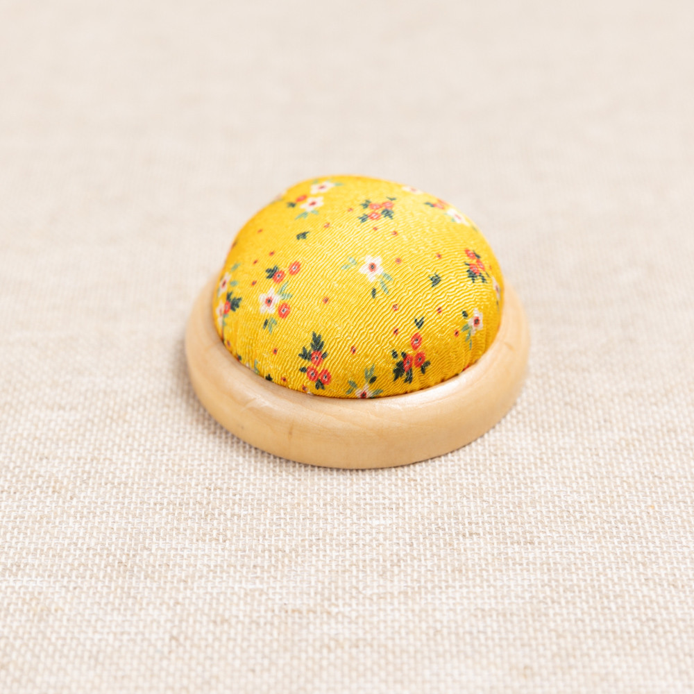 Stuffed pin cushion with wooden base. This pin cushion has a ditsy floral pattern on yellow.
