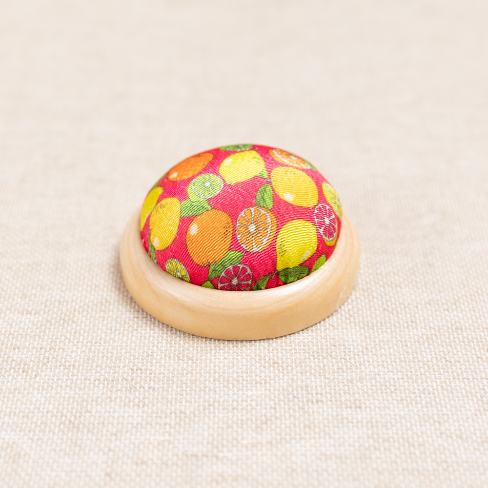 Stuffed pin cushion with wooden base. This pin cushion has a a pattern of tropical fruits in bright colours on a pink background.