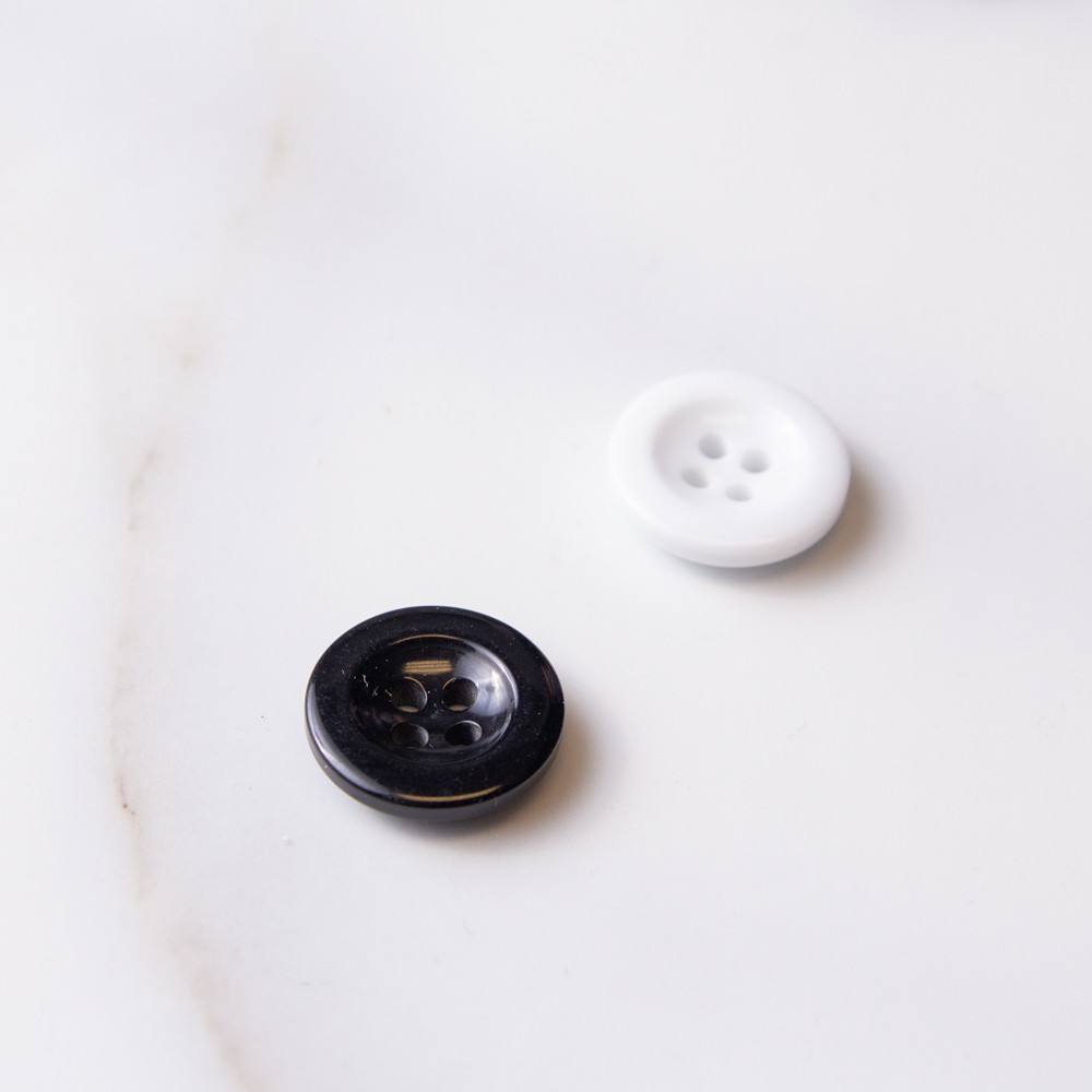 Simple round plastic button with four holes.