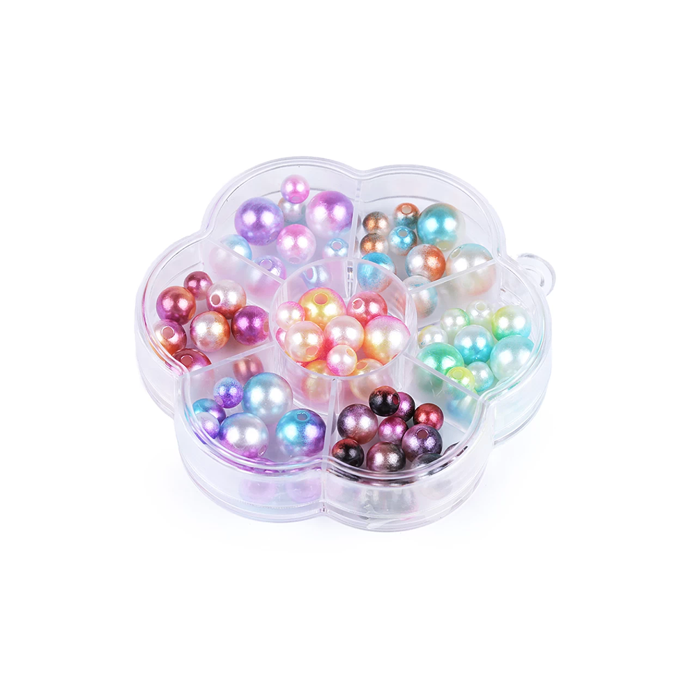 This flower-shaped plastic box contains a colourful mix of plastic beads. Contains round beads with an iridescent pearl finish. Diameter: 5 - 10mm Pu… Read More