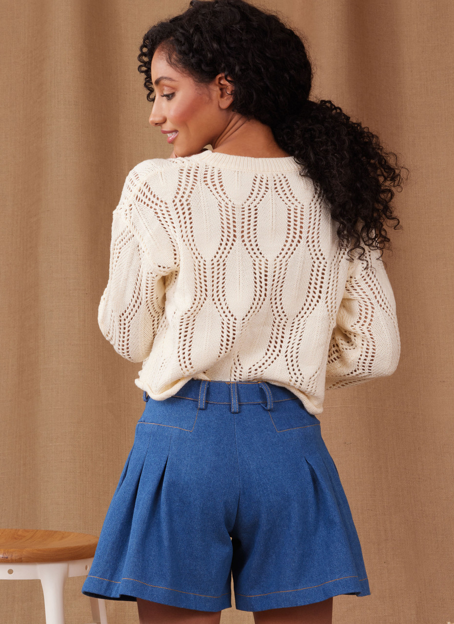 Pleated shorts and pants have side seam pockets, front fly zipper with button closure and wide leg. View B cropped pants, View C full length.