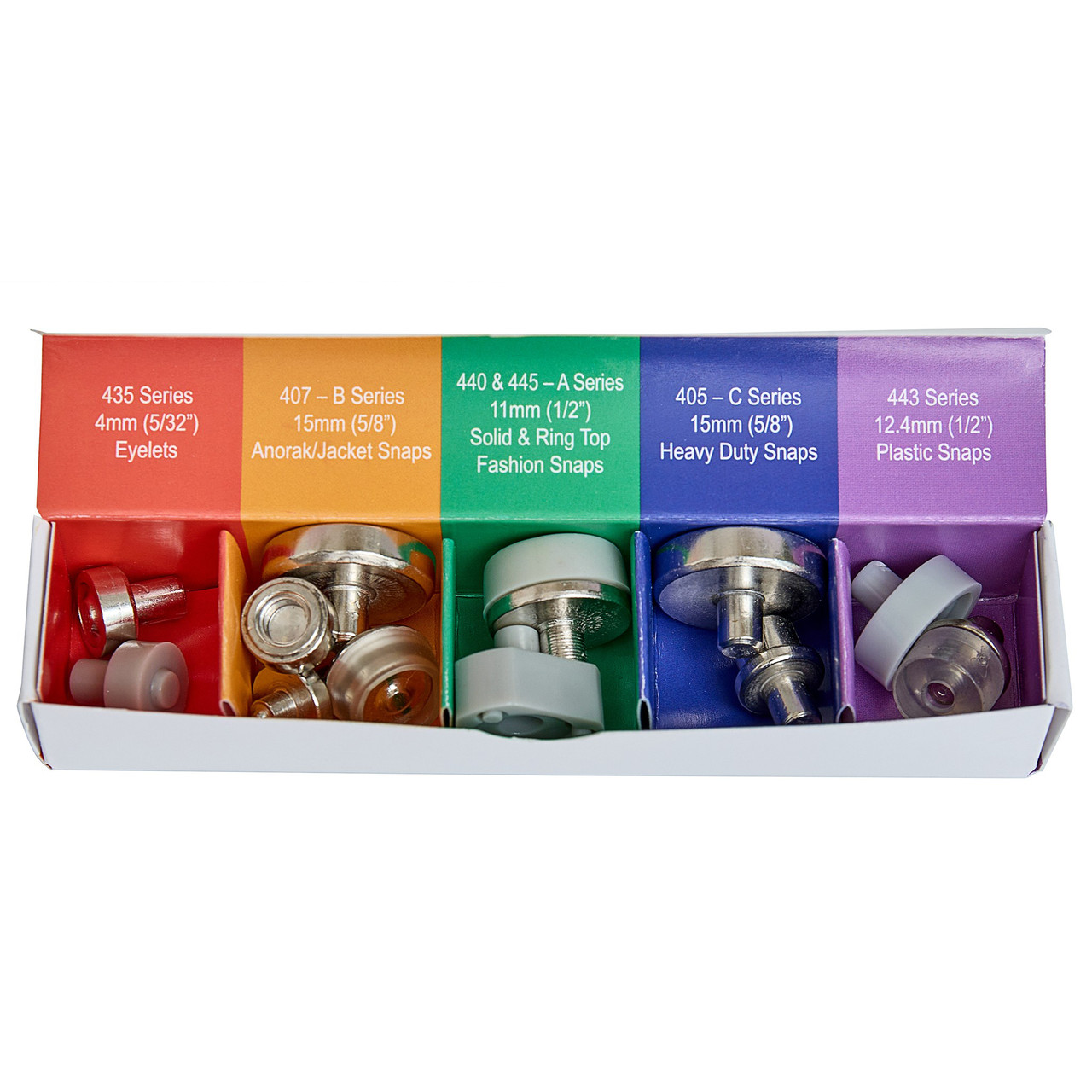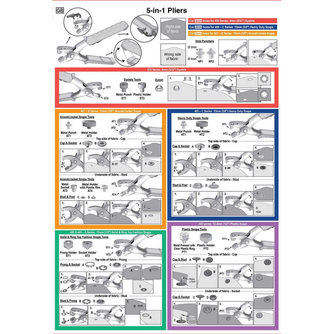 Pliers with interchangeable tools for 5 applications. Each set contains: Pliers, interchangeable tools for 5 applications, hole punching tools to make 3mm or 4mm holes, a tool remover, 5 sets of tools for: 15mm (5/8") Heavy Duty Snaps C Series (H405), 4mm (5/32?) Eyelets (H435), 12.4mm (1/2?) Plastic Snaps (H443), 11mm (1/2?) Solid & Ring Top Fashion Snaps A Series (H440 & H445), 15mm (5/8?) Anorak/Jacket Snaps B Series (H407). Item size: (d/w/h) 2.4 x 10.3 x 23.4cm.