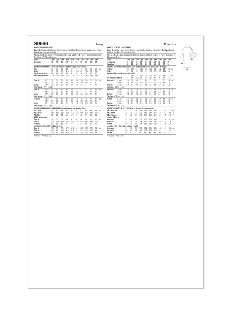 Lined coat and jacket features attached scarf and has button front closure and pockets. Coat comes in two lengths. View C is a short jacket.