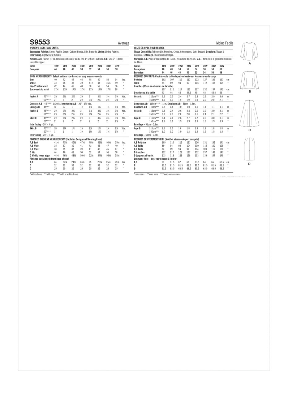 Fitted, lined jacket has asymmetrical closure with contrast binding and three-quarter or long sleeves. Full skirt with front pleats has high-low hem and back zipper. Straight skirt has back hem vent and zipper.
