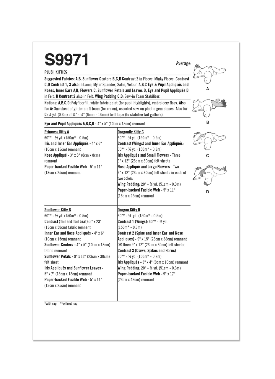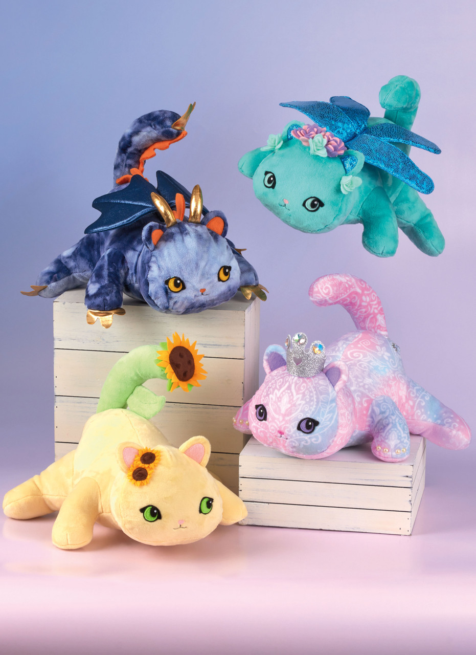 Fantasy-themed plush kitties measuring 18" (46cm) long by 8" (21cm) tall have contrast inner ears and appliqued faces with embroidered mouths. Princess kitty has craft foam crown and jewel accents. Sunflower kitty has contrast tail with leaf to mimic flower stem and felt sunflowers. Dragonfly kitty has padded contrast wings, novelty tail and felt flowers. Dragon kitty has padded wings, plush horns and fused fabric spikes and claws. See envelope for more information.