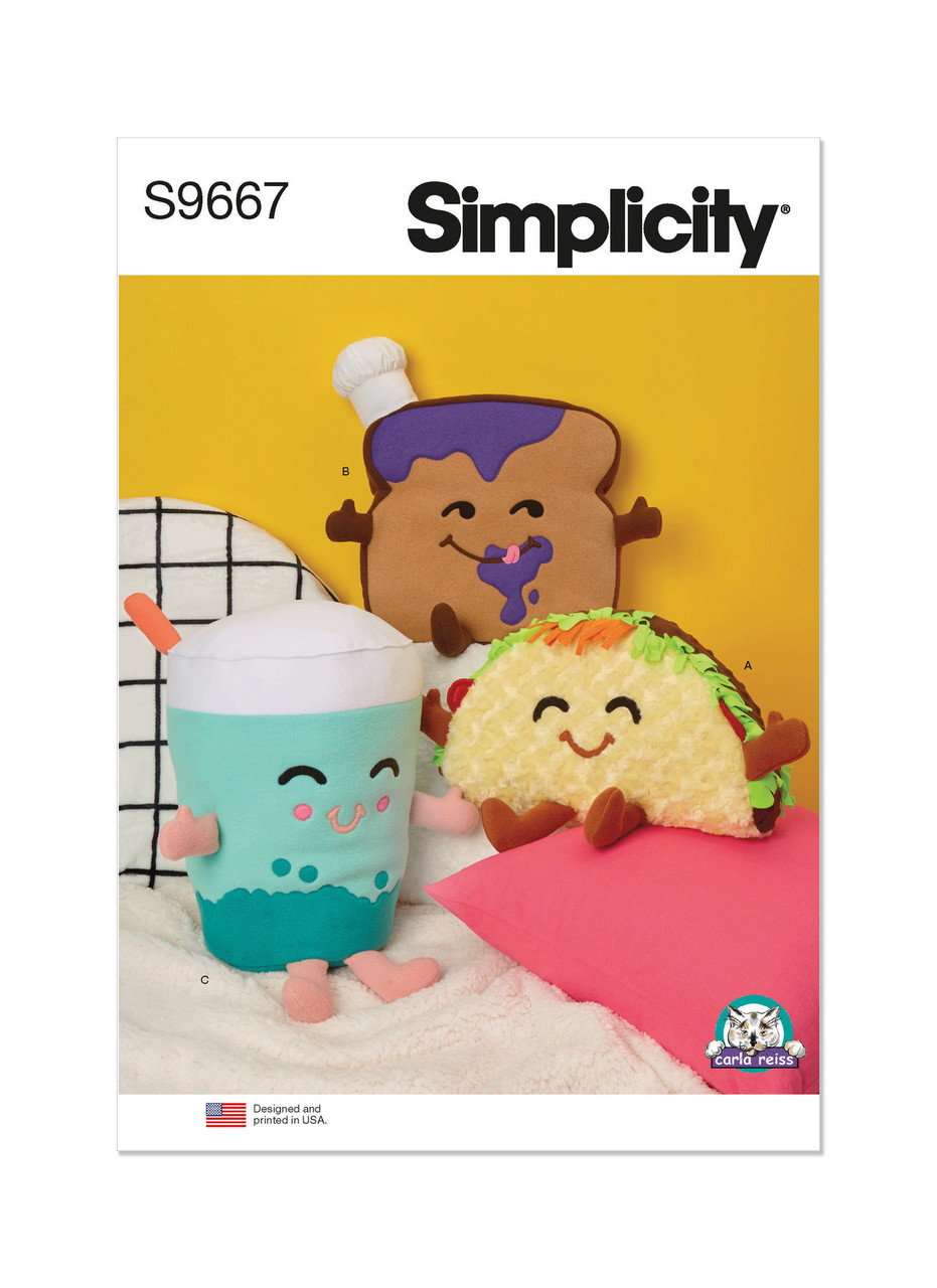 Adorable plush foods have appliqued faces and plush arms and legs for a fun take on a taco, toast with jelly, and bubble tea. Taco has fringed lettuce, cheese, and tomato "ears". Toast has 3D chef's hat. Bubble tea has 3D straw. See envelope for more information.