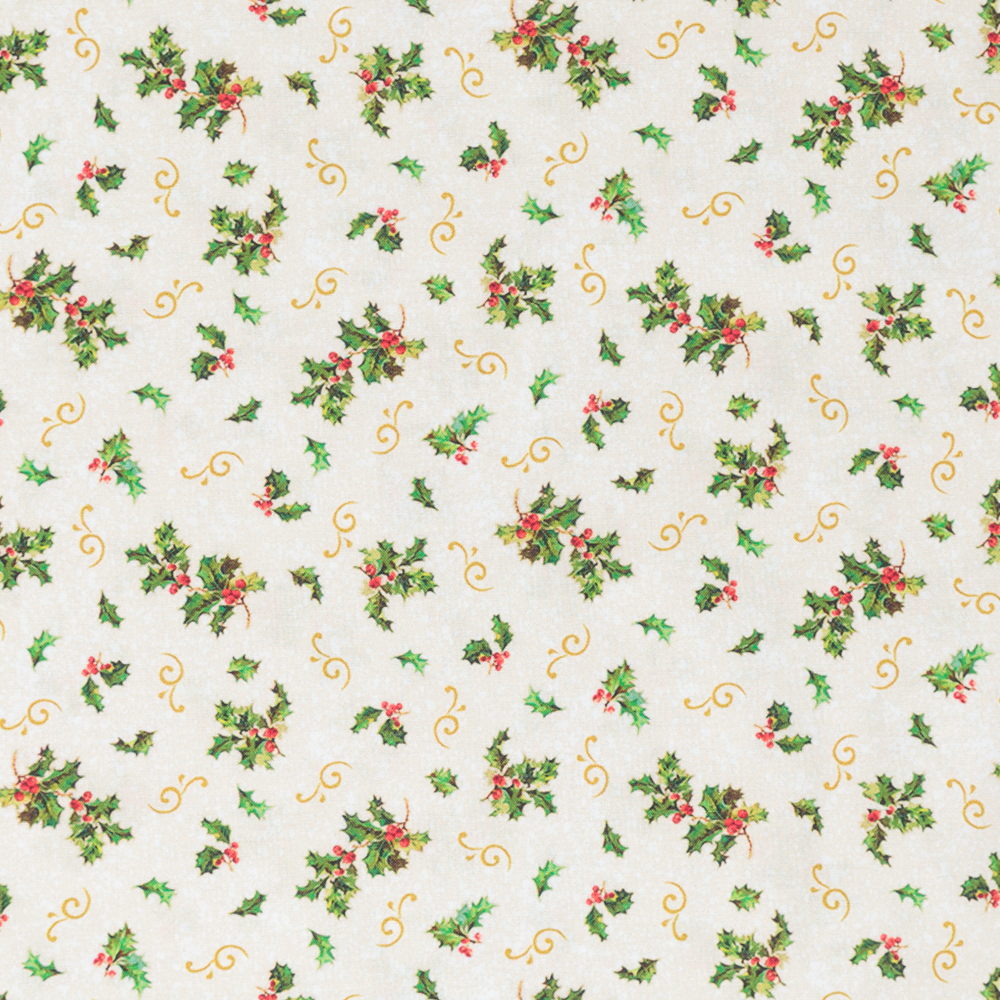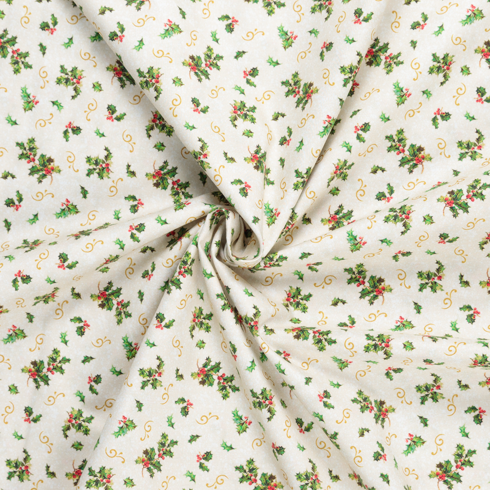 Cream base with small green holly and small gold berries. Beautiful, high quality, printed fabric. Ideal for quilting, masks, crafts, displays, table decoration and as a dressmaking fabric.