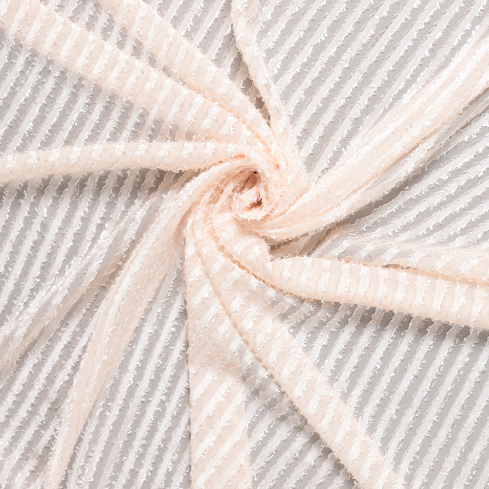 Forget the nines - this Diagonal Devore in Champagne has you dressing to the tens. Lustrous, tone-on-tone stripes glide across a sheer champagne base, their subtle shimmer catching the light with every movement. Crafted from supersoft polyester, this fabric pairs a twill-inspired texture with a featherlight drape and cool, elegant hand.
