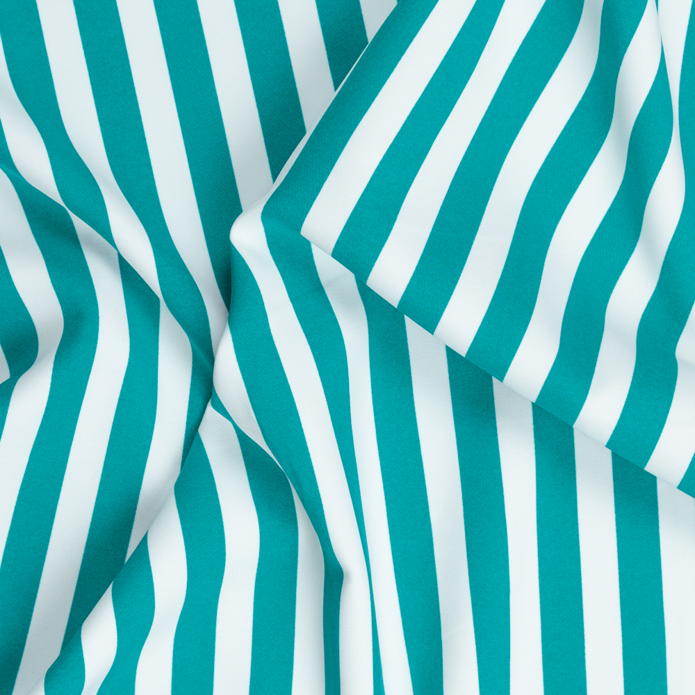 Make waves with this crisp Polyester Stripe in Turquoise & White, featuring bold ¾” bands that bring a fresh, modern energy. Smooth to the touch with a structured drape, it’s light to midweight with a touch of stretch widthwise and a gentle give on the length. Relatively opaque with a clean finish, it’s a standout choice for statement shirting, sharp shirt dresses, summer co-ords, or breezy tailored separates. A lining is optional, depending on the look you’re going for - but the confidence it brings? Unquestionable.