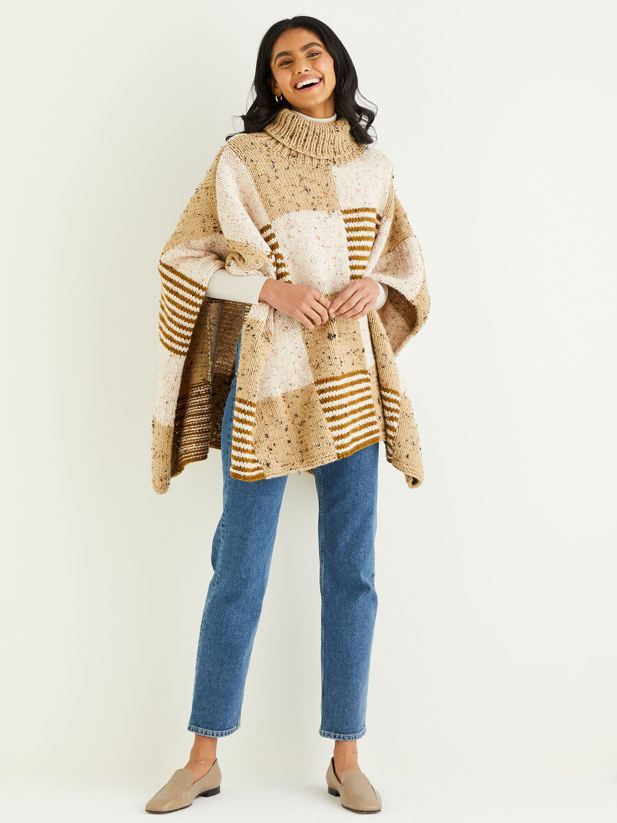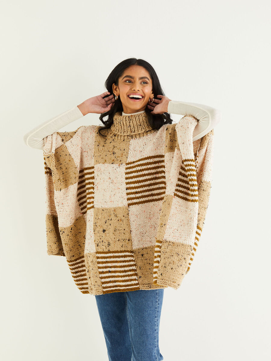 Throw this poncho over any outfit for instant impact. The simple, shape allows you to focus on the intarsia technique to create the solid and striped chequerboard squares in go-with-anything natural shades. A chunky roll neck will keep you toasty while open sides mean you'll only need to sew-up across the shoulders.