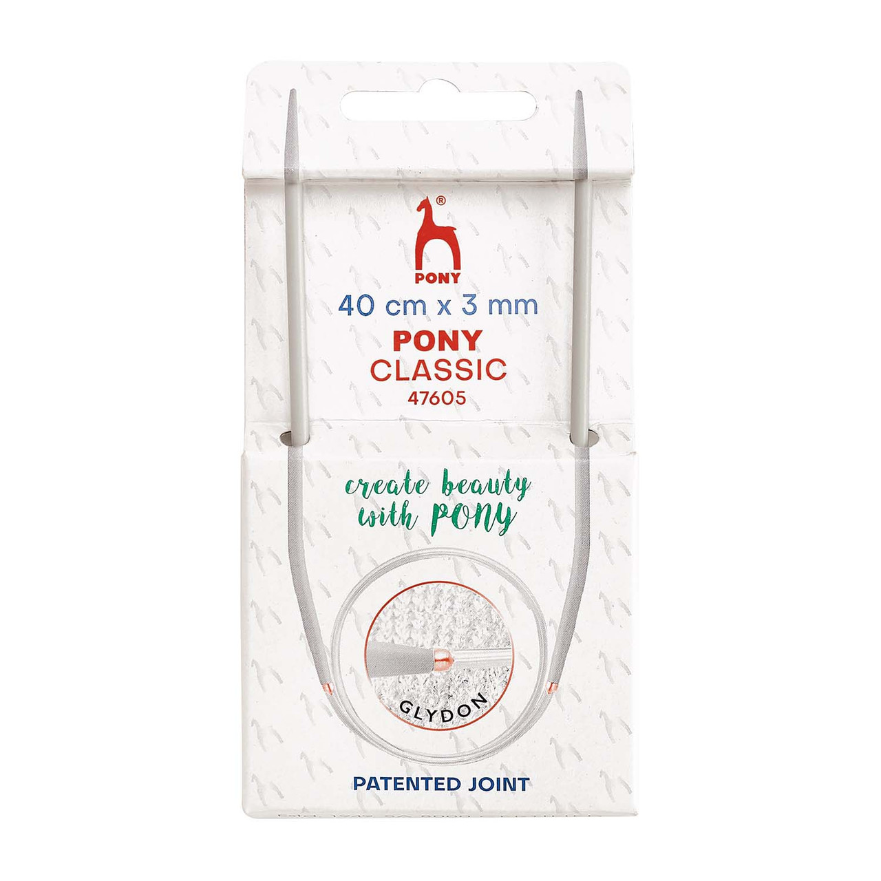 These traditional circular needles are a classic from Pony. Made from solid aluminium with smooth anodized silver grey finish, they are extremely lightweight and never lose desirability with changing trends. The patented Glydon joint between the needle and the cable ensures an ultra-smooth and snag-free transition of the stitches onto the clear and soft cable. The gently tapered needles in combination with the Glydon joint make Pony circular needles unique in providing uncompromising comfort and excellent performance.