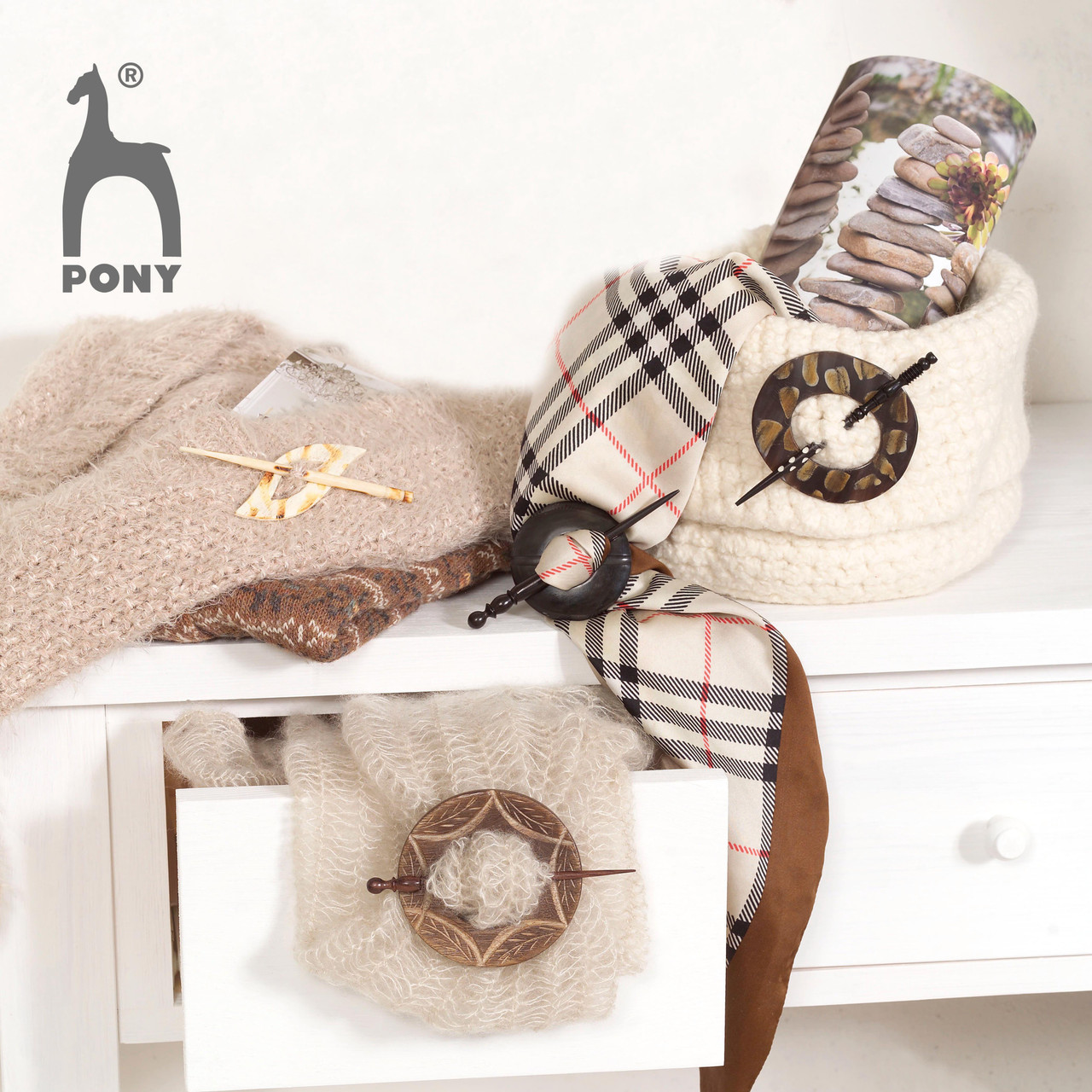 Decorative, wooden brooche and pin sets to provide a stylish finish to shawls and knitted garments. Six beautiful designs available.