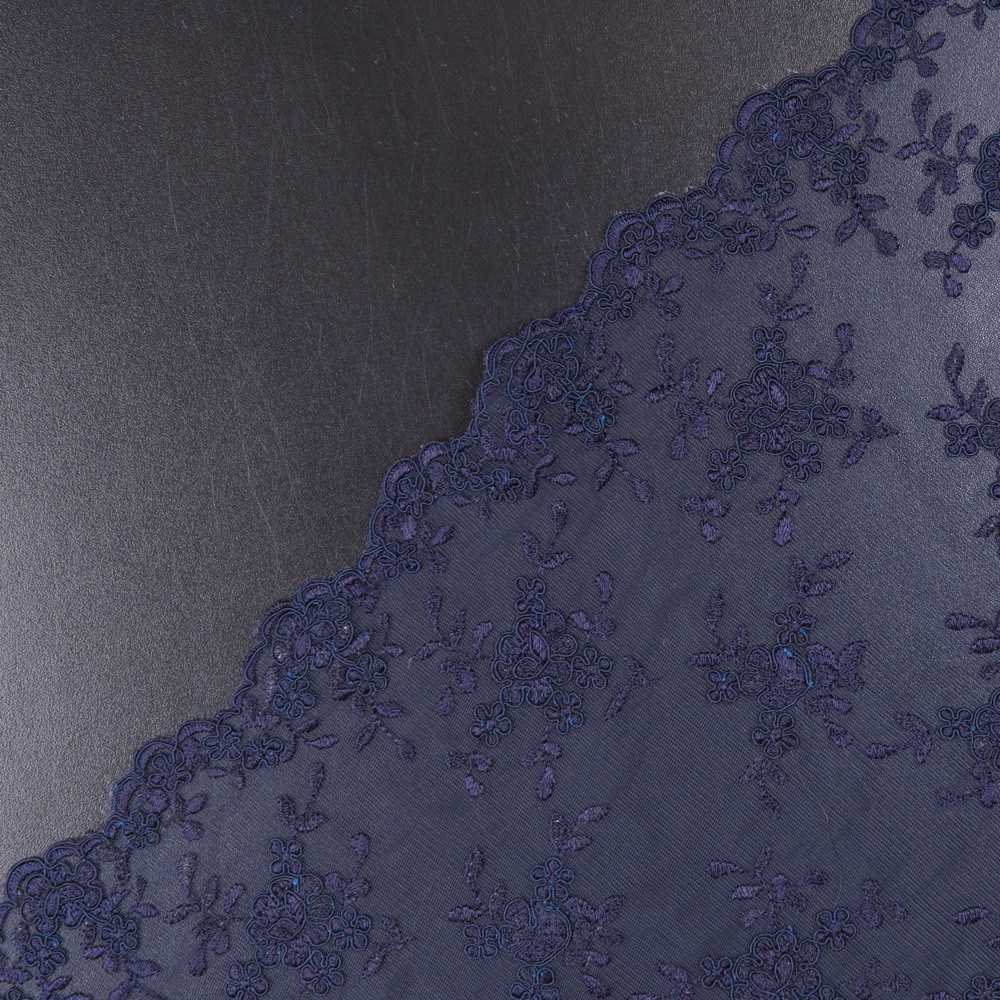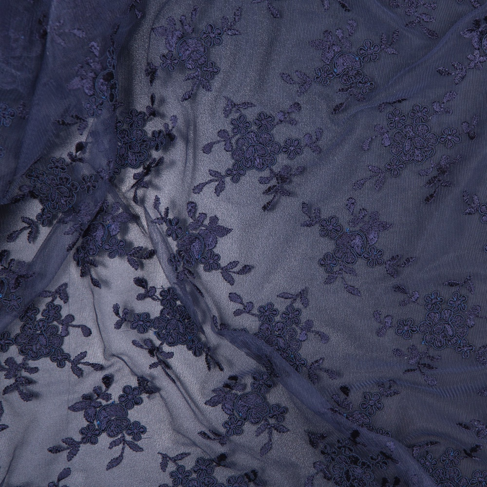 Introducing a collection of enchanting pieces for your big day or night. Take home this stunning Premium Navy Corded Lace on Supersoft Tulle for wedding gowns or gala dresses. Floral clusters scatter across a thin supersoft tulle and into a scalloped edge on either side. With its corded outline, it has a three-dimensional appearance that makes its design pop. Thin and lightweight, it has a fuller drape that is perfect for A-line pieces.