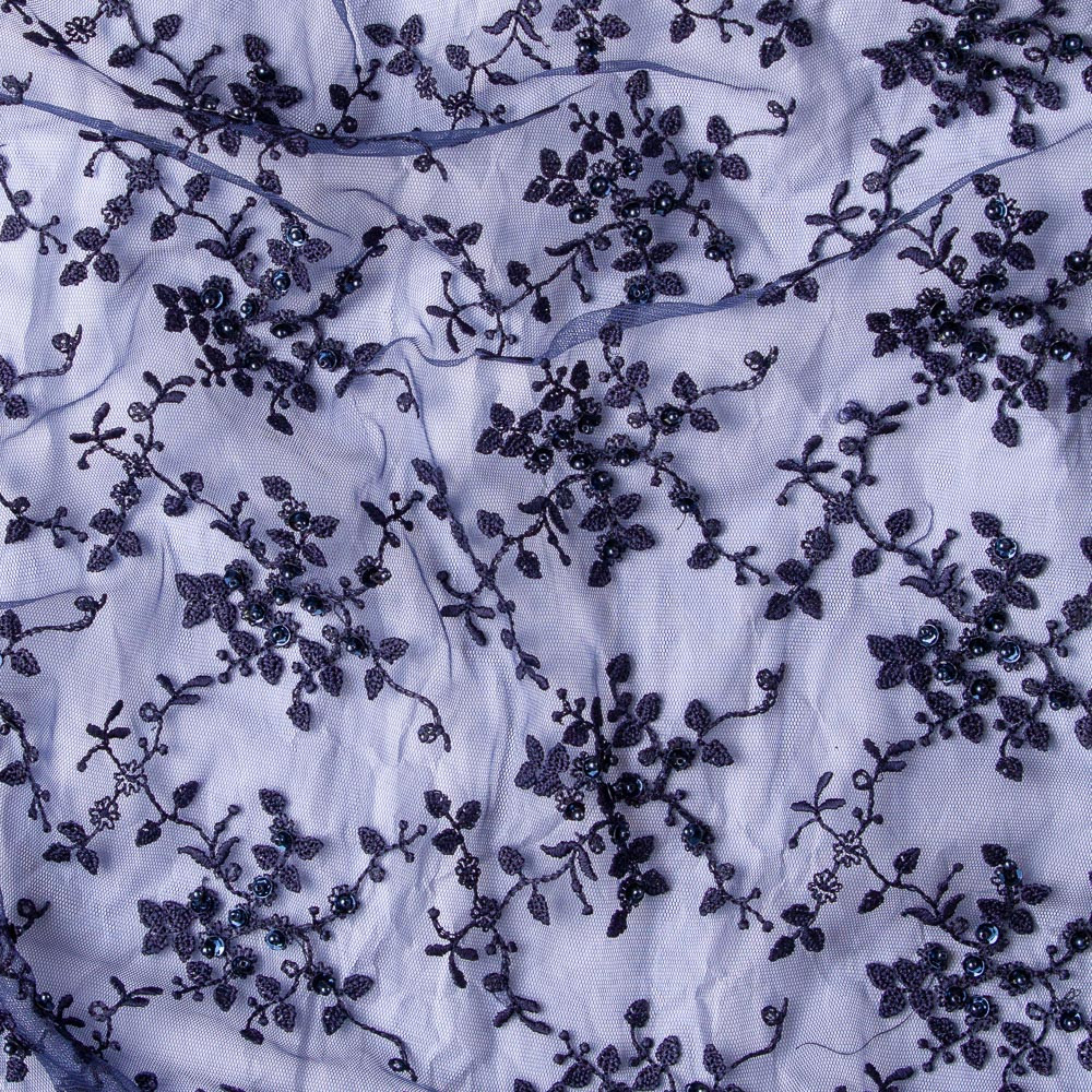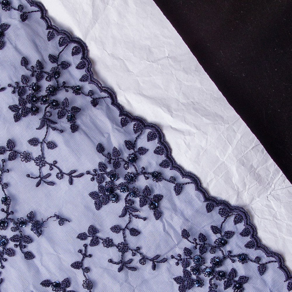 With a supple drape this Navy Lace w/Pearls & Sequins is a crowning addition to your formal wear designs. Live like royalty with this lace, featuring a tulle ground adorned with pretty embroidery, pearl beads, and navy sequins in a blossoming floral pattern. Finished scalloped edges make creating statement hems and sleeves a breeze. The lightweight and textured hand are perfect for luxurious gowns, stunning special occasion dresses, and more. As this fabric is entirely sheer, a lining or solid fabric may be necessary for opacity, depending on your project.