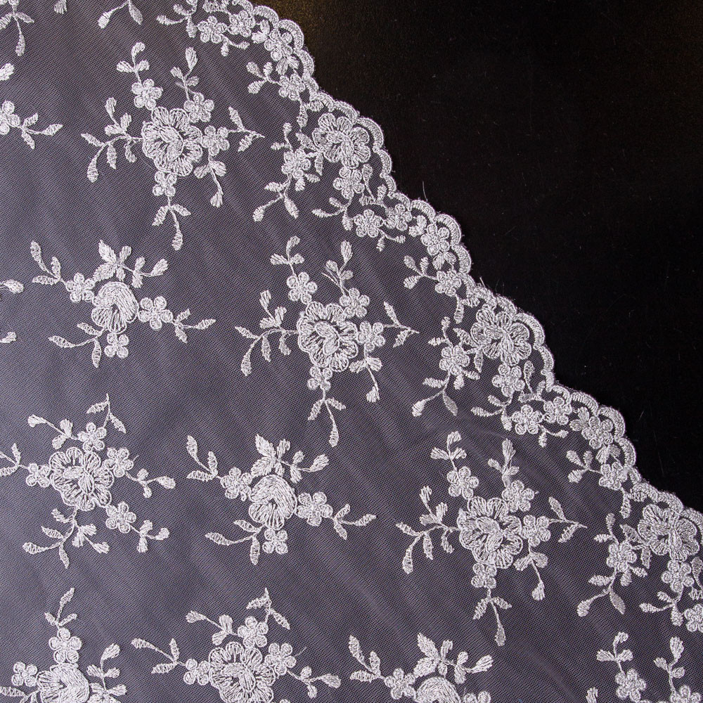 Absolutely stunning, make an unforgettable entrance in this Premium Silver Embroidered Floral Lace. Bundles of flowers bloom across its core, while its sides feature clusters of flowers along a scalloped eyelash edge. Embroidered with metallic thread, this medium glimmers and catches the light beautifully. Its full drape will only further the lavish appeal of floor length gowns and long trains. Move gracefully along the floor in this one-of-a-kind piece.