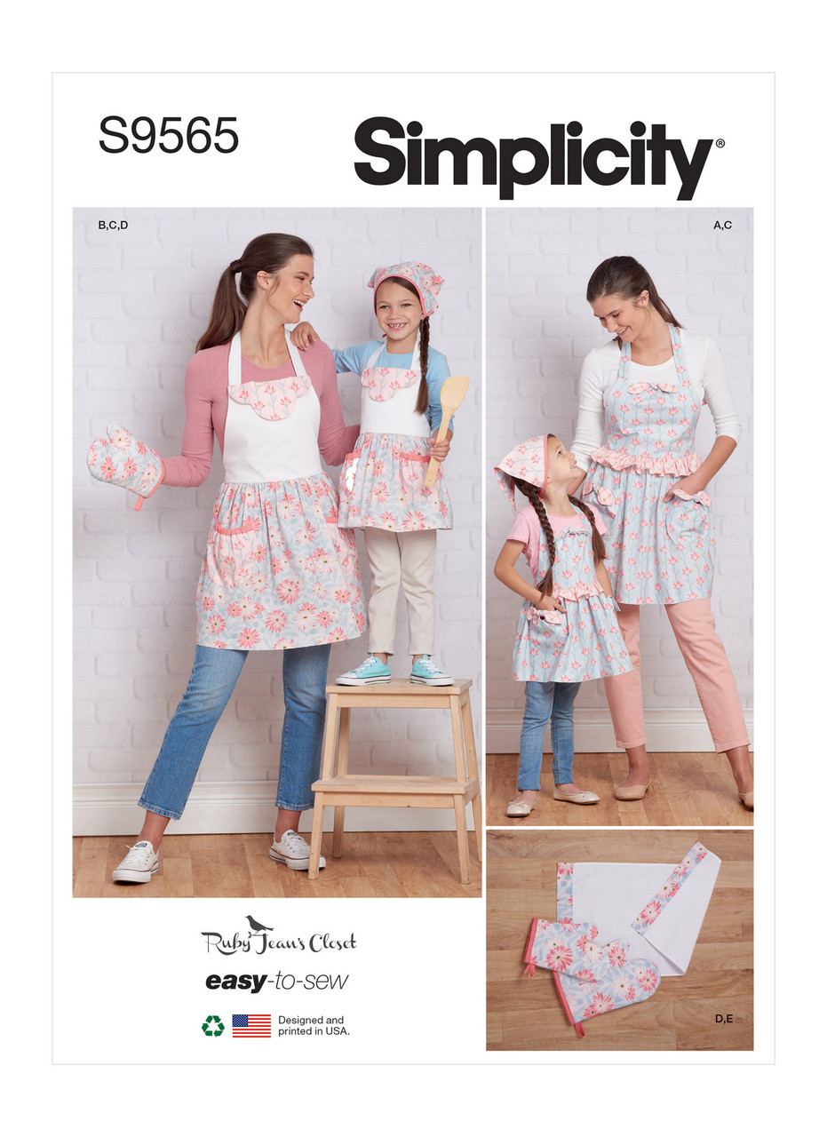 Charming mommy and me aprons have self-lined bibs, neck straps, tie ends and gathered knee length skirts with oversized pockets. Details include contrast ruffles, tie bows and scalloped bib flaps. Triangular head scarf, oven mitt and hand towel accessories included. See envelope for more information.