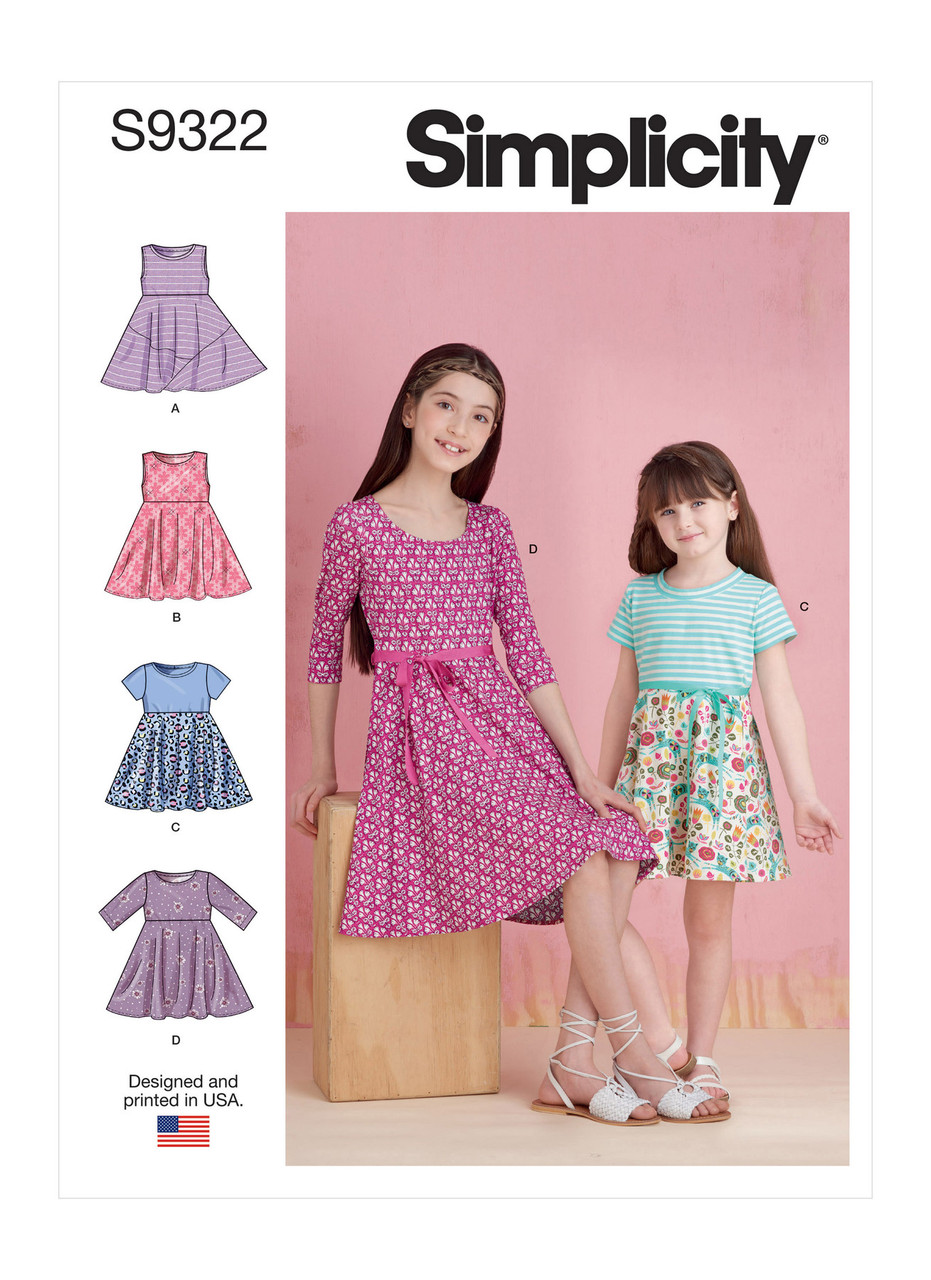 Children's and girls' pullover dresses have bodice, raised waist on skirt, narrow hem and purchased ribbon belt.