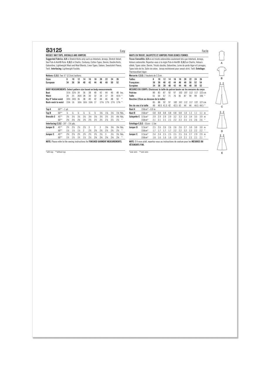 Fitted pullover knit top sewing patterns can be made sleeveless with mock turtleneck or with short sleeves and round neckline finished with narrow neck band. Relaxed fit overalls and jumpers have deep armholes, front and back yokes, wide faux-buttoned shoulder straps, patch pockets and top stitching details. Pull on wide-legged overalls are cropped length. A-line pullover jumpers can be made in below or above knee length. See envelope for more information.