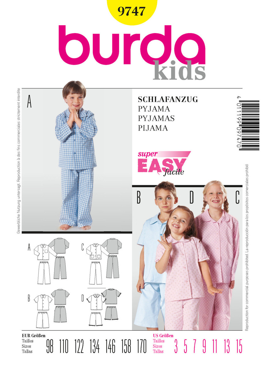 Pyjama with bungee-cord Trousers and buttoned shirt. AC with long Trousers and long sleeves, BD with shorts and short sleeves. With square collar for boys. Peter Pan collar for girls.