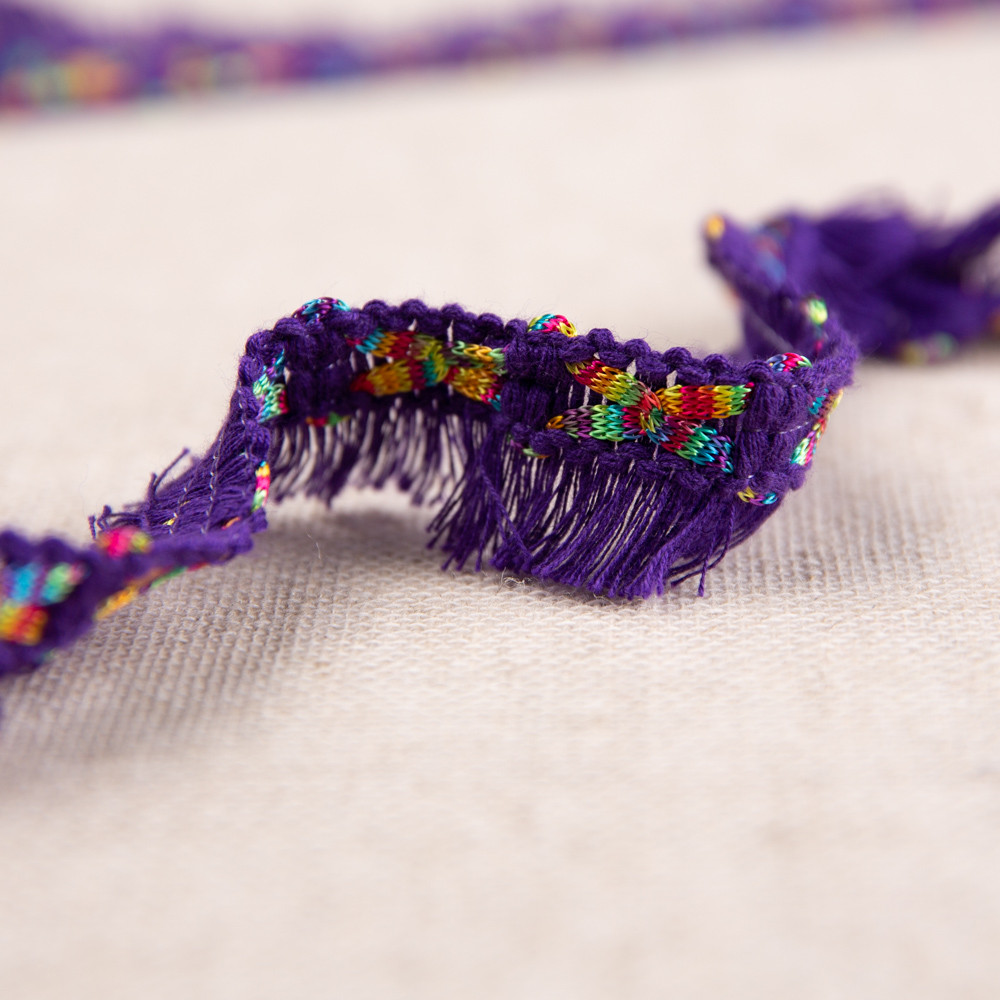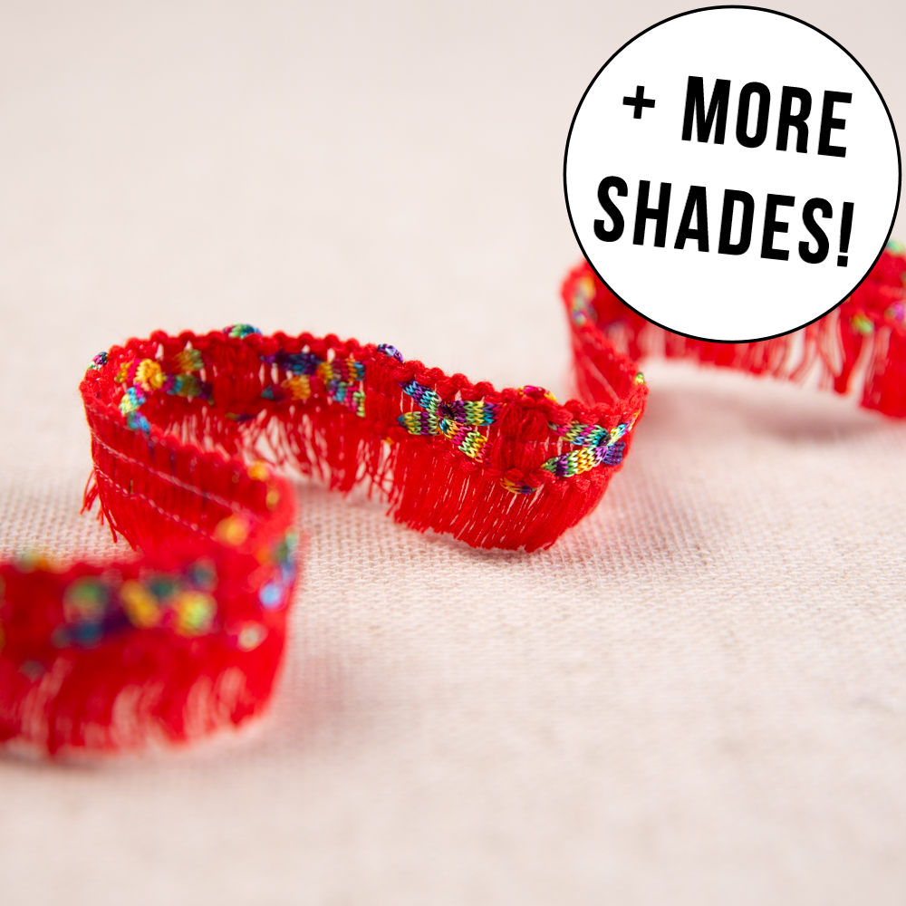 A quirky fringe trim with added rainbow design in various colours. Use it for hemming sleeves, dresses, or necklines. You can also apply it to home decor applications such as couch finishing, drapery details, etc.