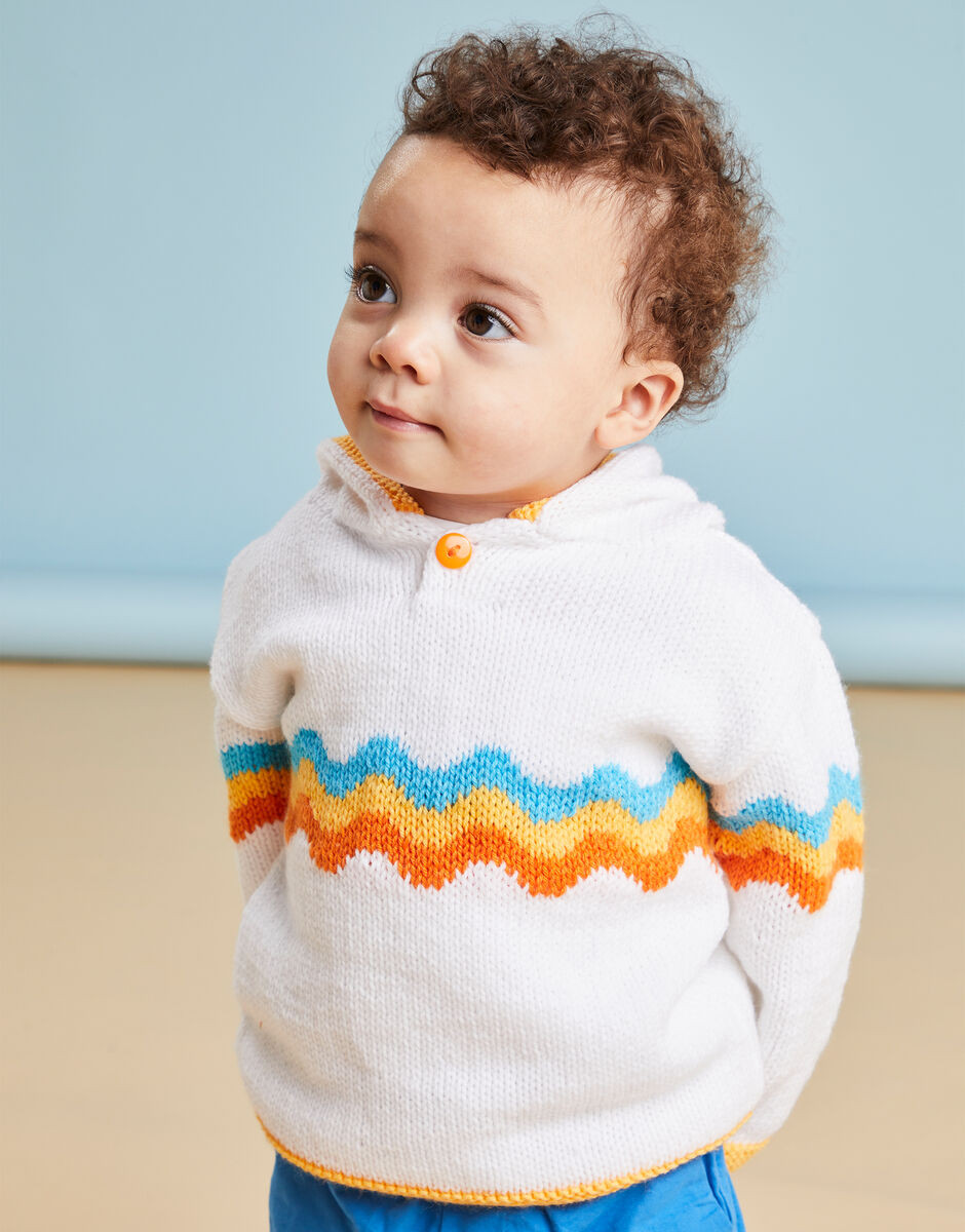This knitting pattern includes the fair Isle technique which is used to create the waves on the body of this little hoodie. Tl complete your child’s Rainbow Wave Hoodie, you’ll knit garter stitch for the trims and add a button at the top for fastening.