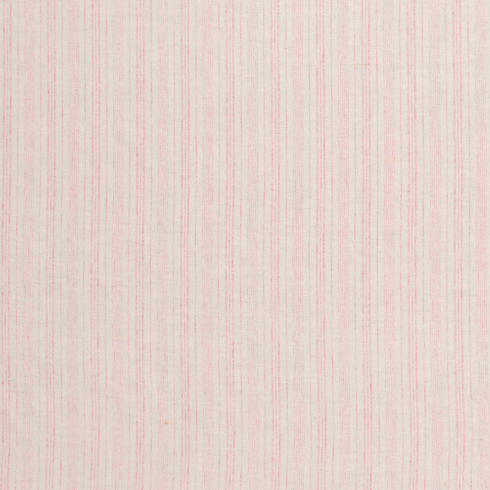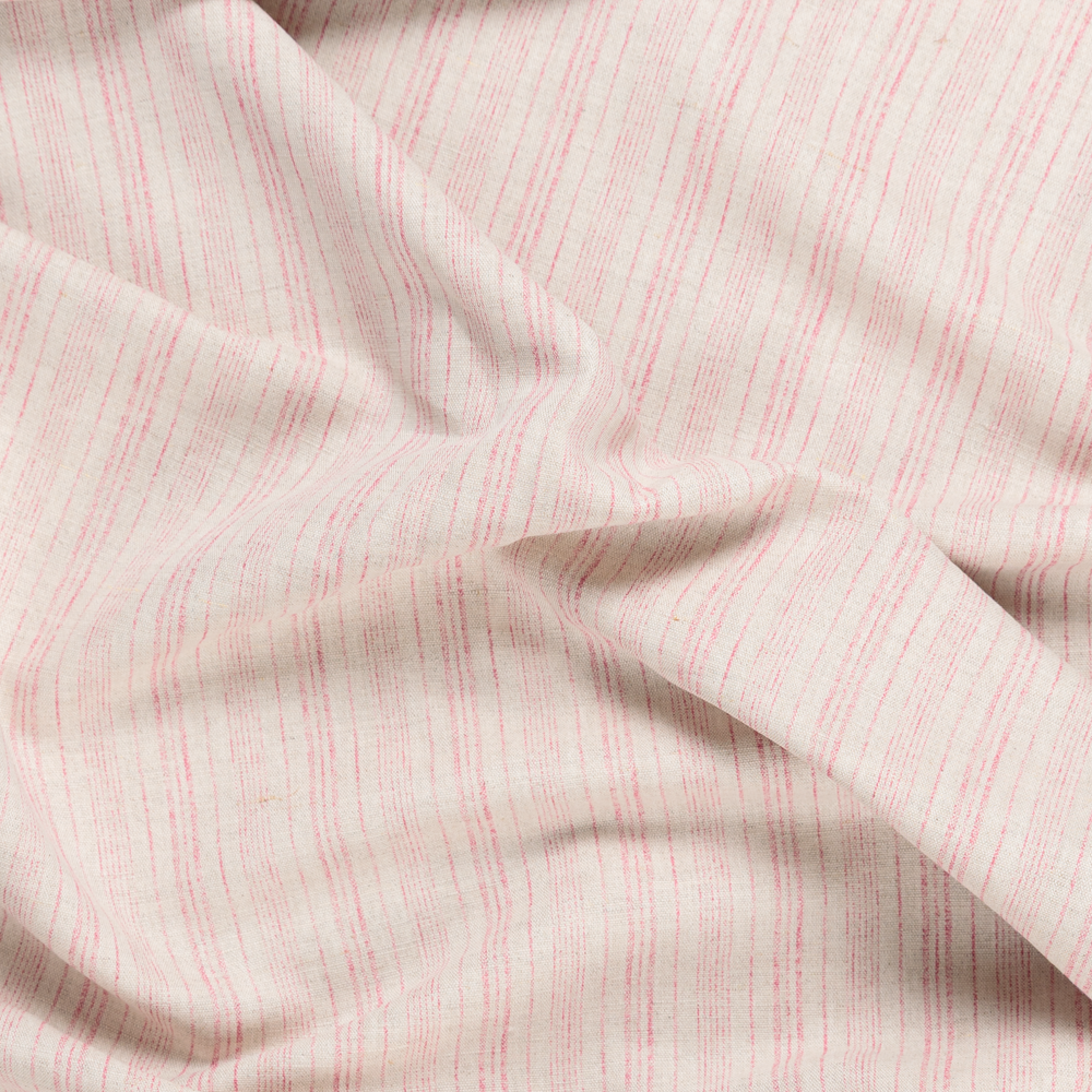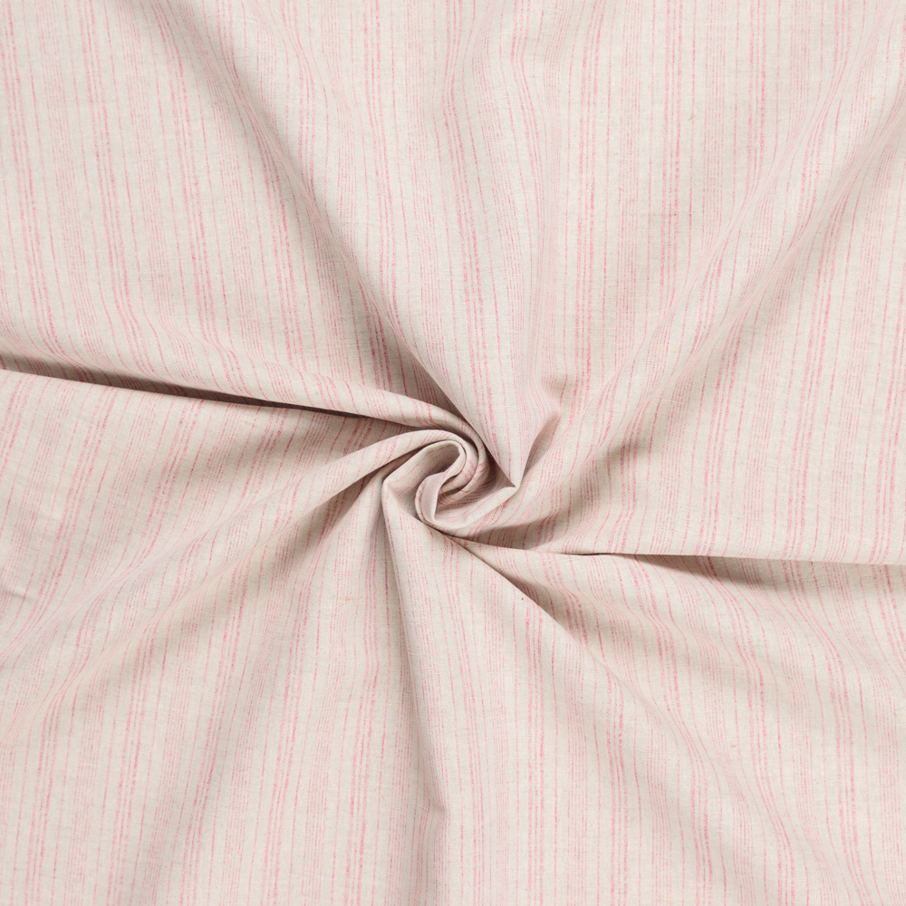 Blending the texture of linen and cotton this Raspberry Stripe Linen Cotton Blend is truly one-of-a-kind. Raspberry stripes run throughout a washed look ecru background, the definition of natural appeal. Composed of a blend of cotton and linen fibres, this fabric is soft and cool, with a subtle texture and fluid, easy drape. Craft blouses and button-down shirts, or branch out into dresses, rompers, shorts, and more. Semi-translucent, a lining will increase opacity and structure if desired.