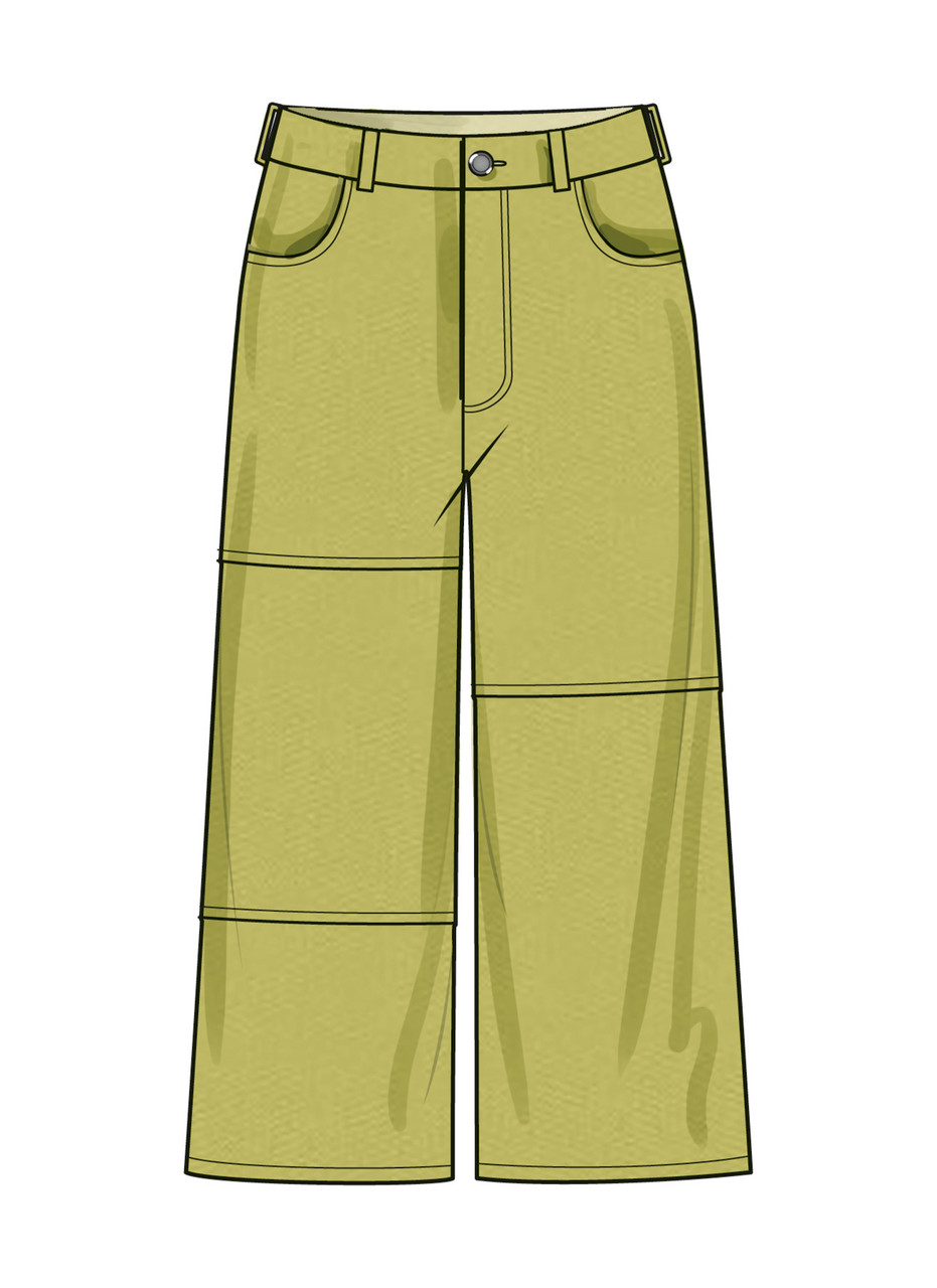 Shorts and pants have front fly zipper with button closure, side and back pockets, and waistband with belt loops. Views A and C have raw frayed edges. View C has two contrasts.