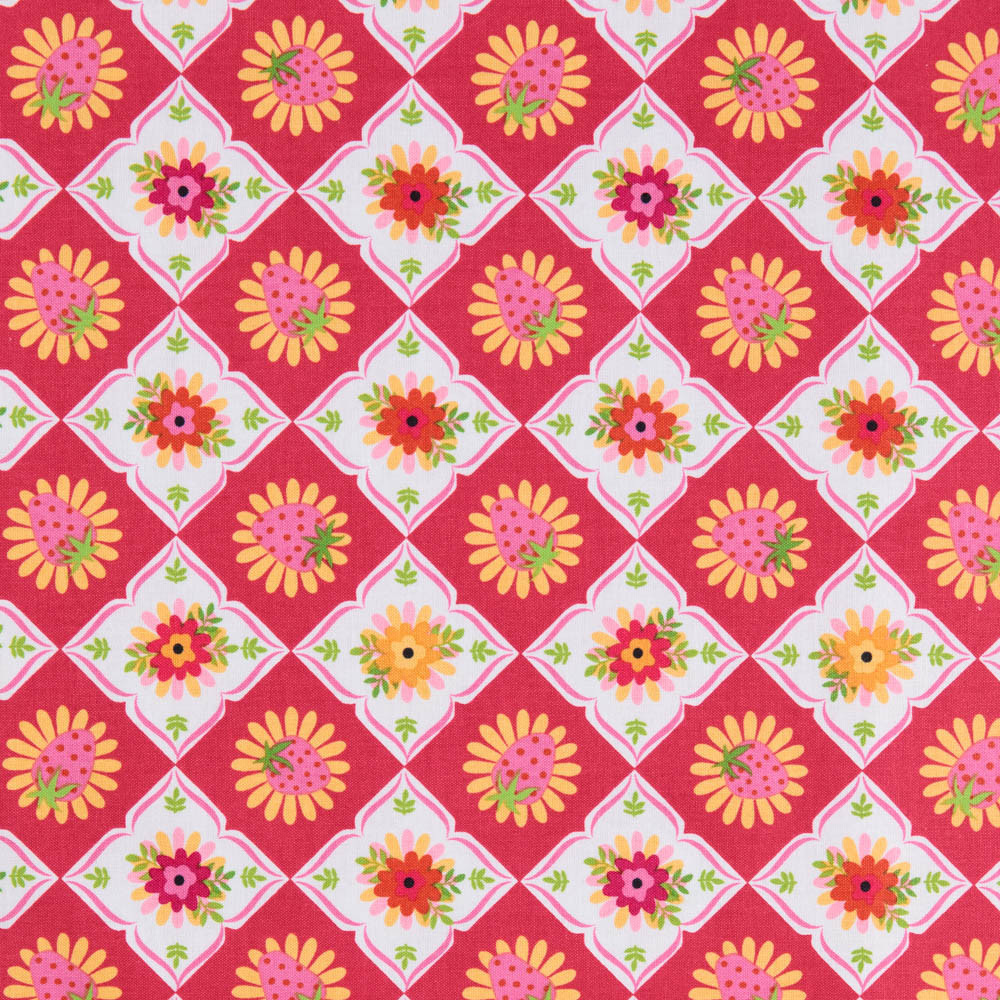 Strawberries and flowers scattered over a red and white diamond background. Beautiful, high quality, printed cotton fabric. Ideal for quilting, masks, crafts, displays, table decoration and as a dressmaking fabric.