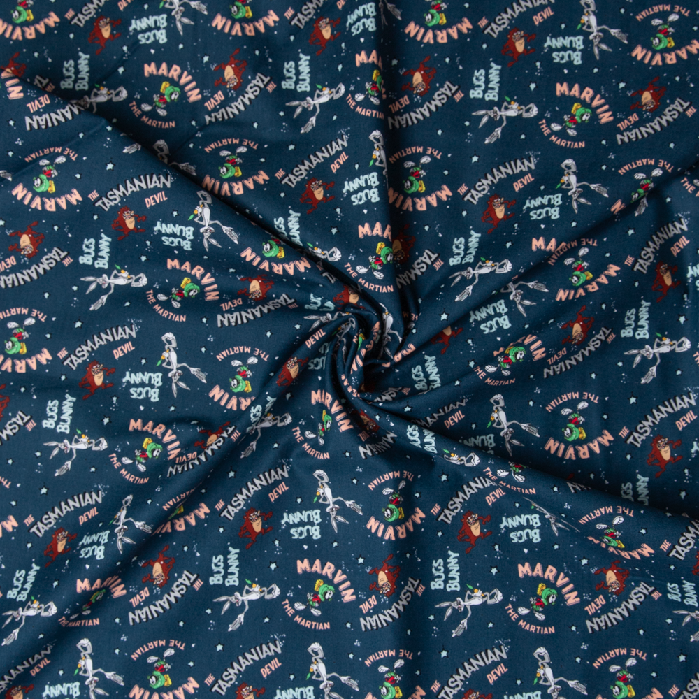 Marvin the Martian, Bugs Bunny and the Tasmanian Devil create this fun allover Loony Tunes print on deep blue. Beautiful, high quality, printed cotton fabric. Ideal for quilting, masks, crafts, displays, table decoration and as a dressmaking fabric.