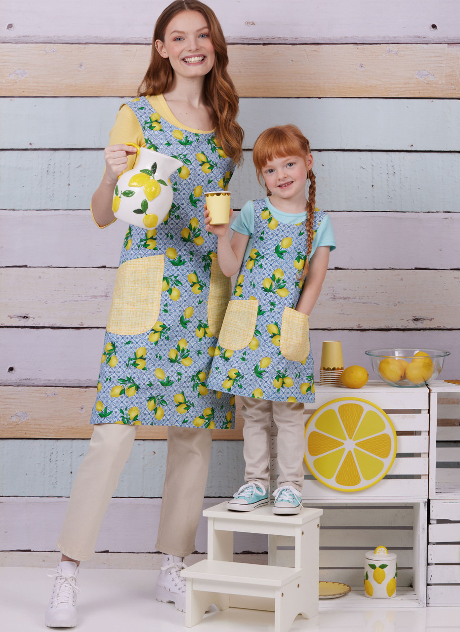 Reversible below knee length cross-back aprons with buttoned shoulders are easy to sew using a single main pattern piece. Each apron has two patch pocket options - one single large pocket, or two smaller pockets, depending on your mood or cooking needs. All aprons are cut crosswise; see envelope for complete cutting layouts and more information.