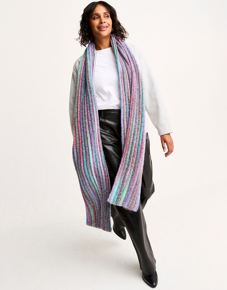 This simple crochet scarf pattern is a great first project for beginners. To crochet the Rich Seam Scarf in ridge stitch, you’ll work half trebles along the length of your starting chain then directly below the top front loop of each subsequent row. The resulting texture-rich rib picks out the jewel-like shades of self-striping Sirdar Jewelspun With Wool. This three-ball project creates an incredibly generous and indulgently cosy scarf. Sirdar Jewelspun With Wool is a self-striping easy care chunky weight yarn, with a hand dyed, handspun look.
