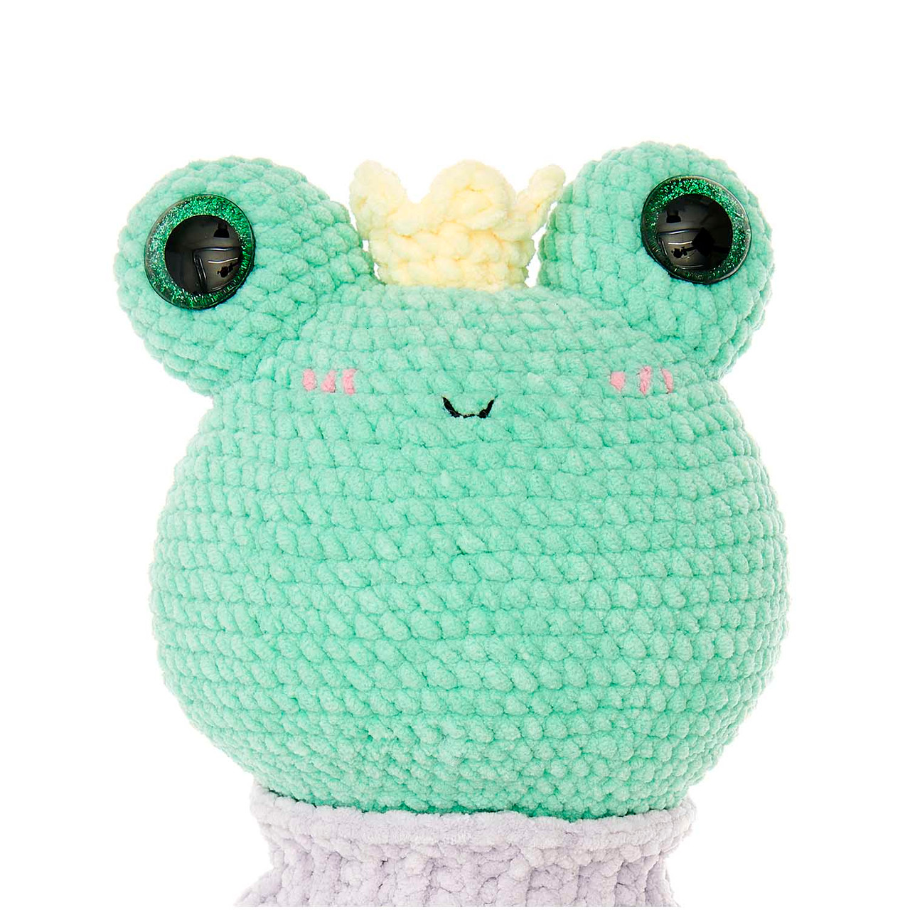 To insert the eyes, slide the desired colour over the black shaft of the eye so that the colour is visible through the transparent part of the eye. Then push the shaft through the corresponding stitch in the desired position. Finally, push the white plastic shell over the barbs of the shaft so that the eye is securely attached to the crochet part.