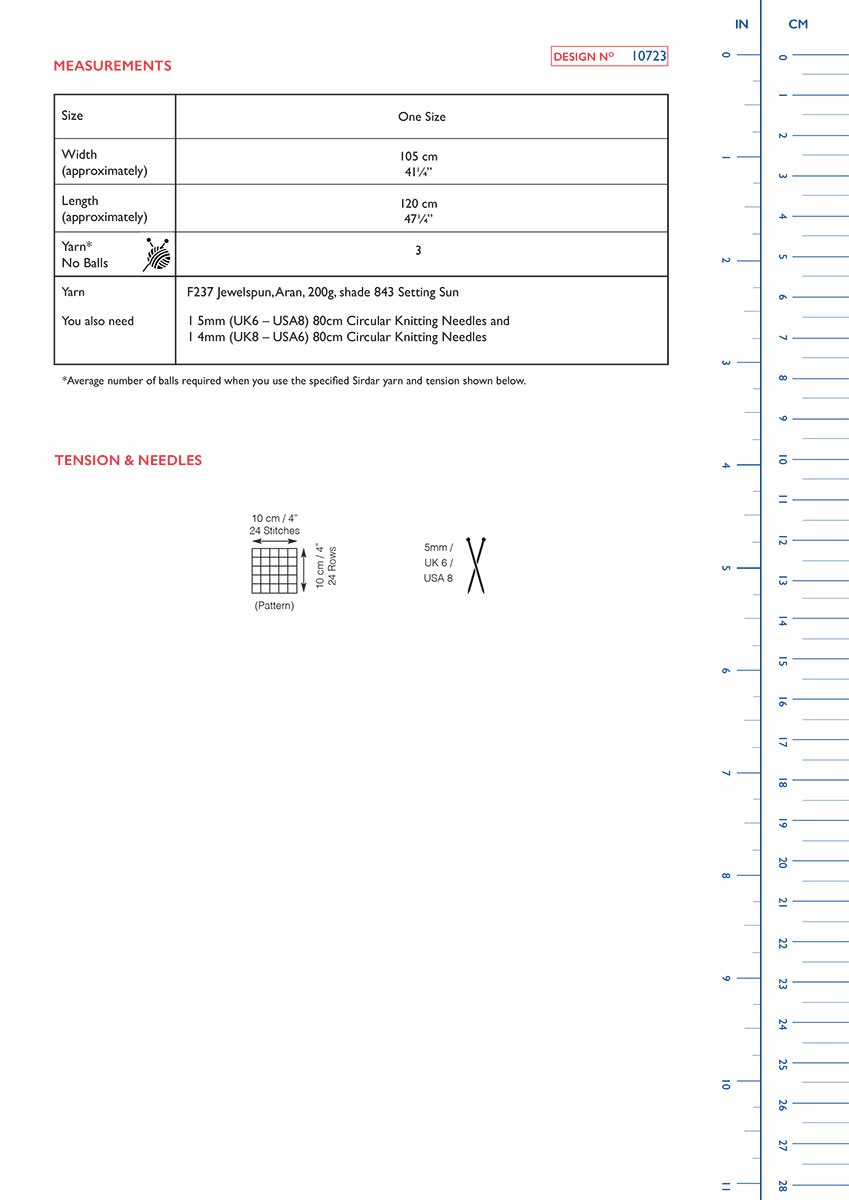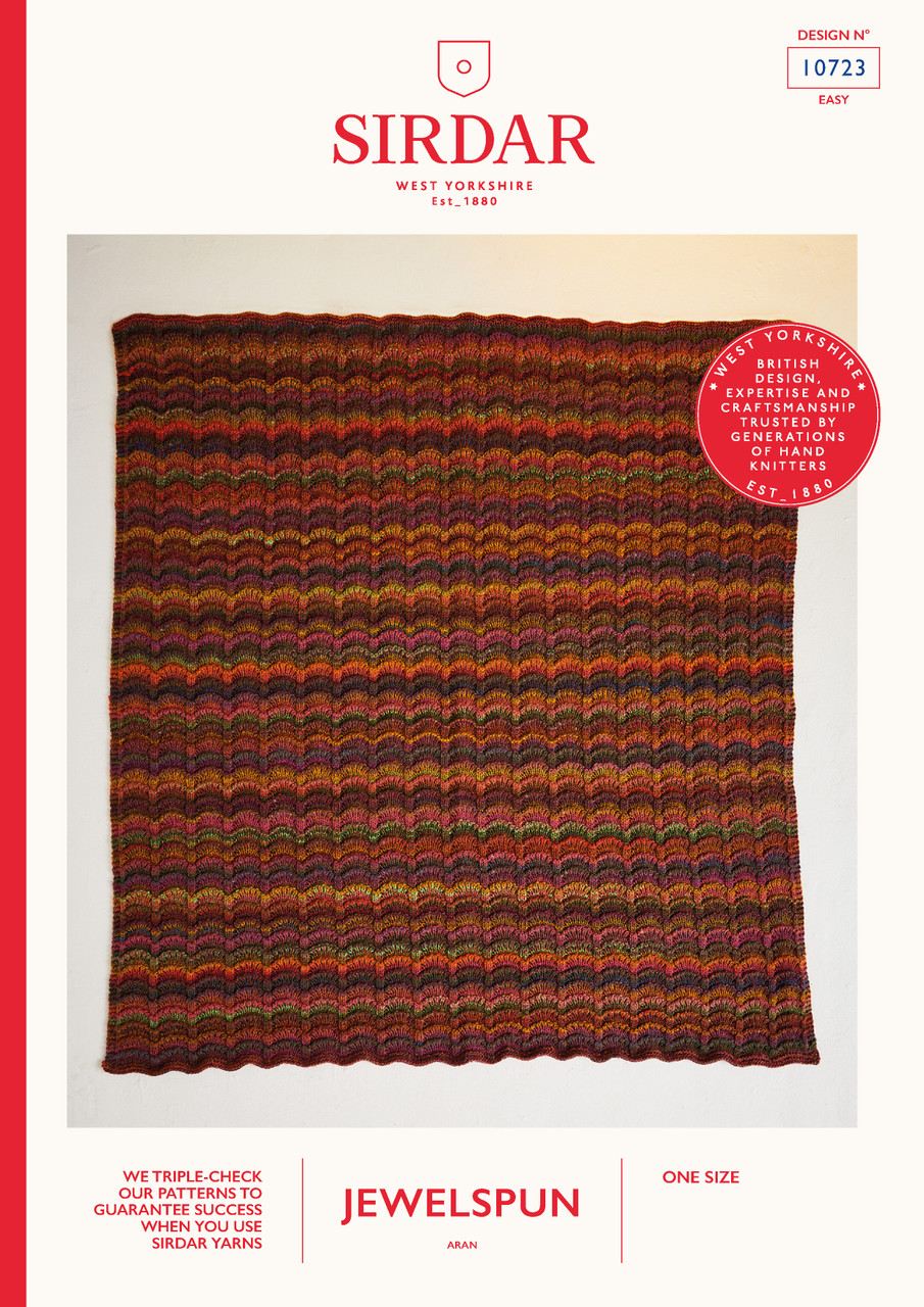 It’s hard to believe you can create such a beautiful hand knit blanket with just 3 balls of self-striping Sirdar Jewelspun. The all-over eyelet stitch forms scalloped stripes of beautiful Sirdar Jewelspun and the open texture gives the hand knit Rippling Meadow Blanket a lovely drape. A garter stitch border prevents curling.