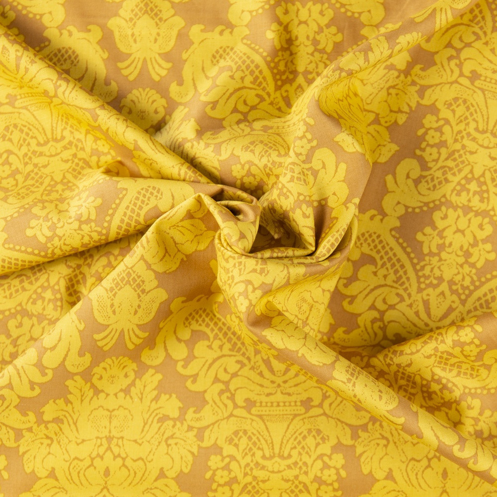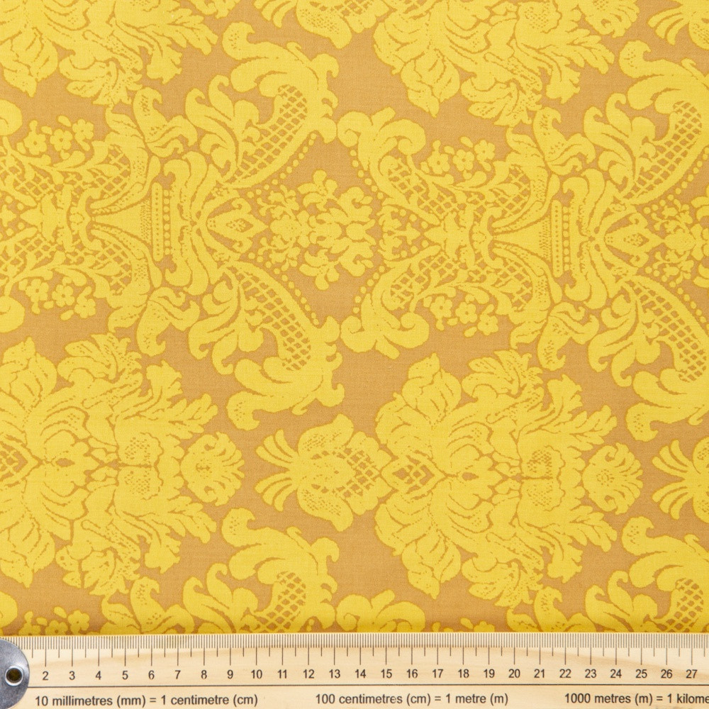 Large allover damask print on a yellow background. Beautiful, high quality, printed cotton fabric. Ideal for quilting, masks, crafts, displays, table decoration and as a dressmaking fabric.